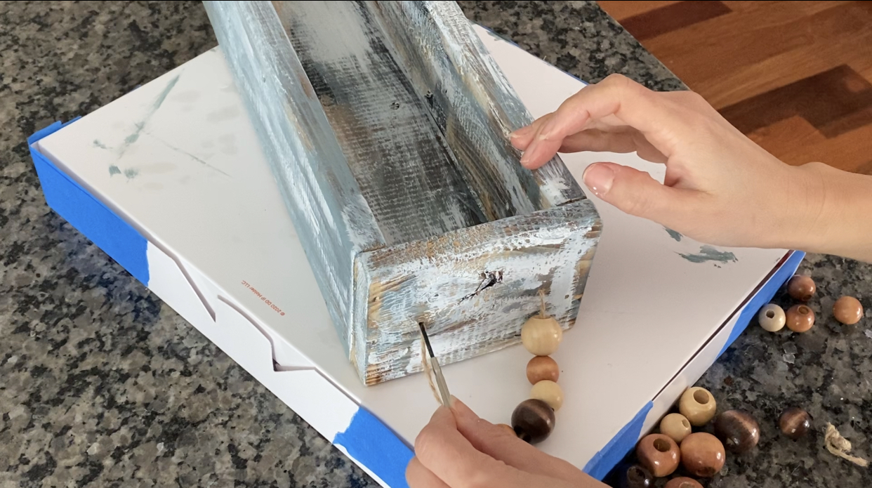I initially wished I had some extra hardware on hand but had to improvise since I couldn’t go out to the store. I decided to take some wooden beads and twine to create a cute and unique handle. I used a small tool to push the twine through the small holes. Make sure your twine is long enough so you can tie the ends together.
