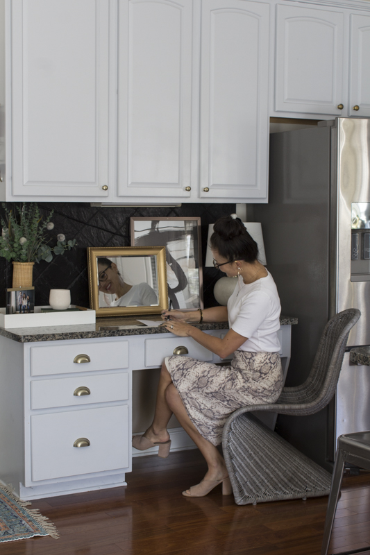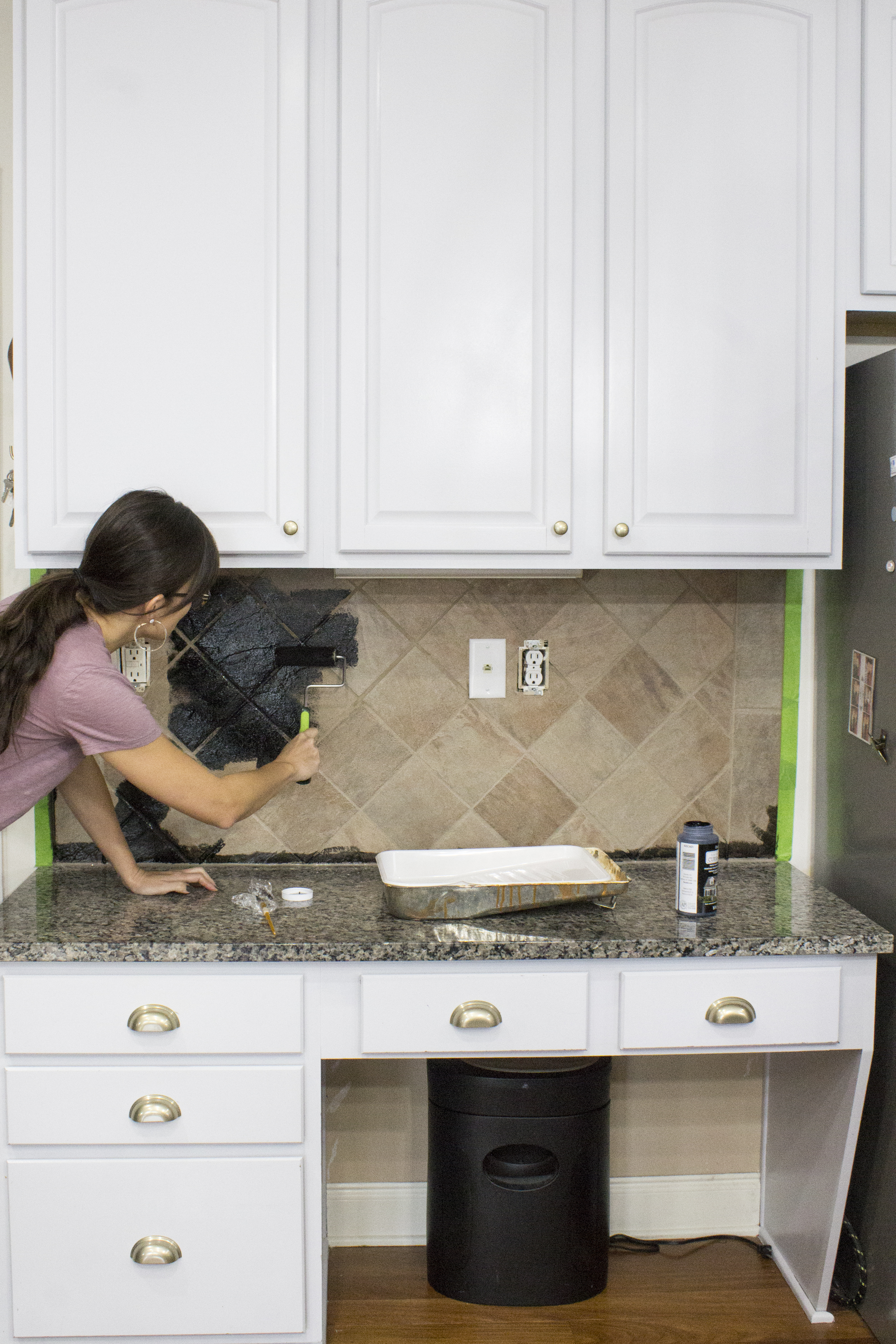 Typically when I paint light colors, I don’t tape. But since I was using black paint, I made sure to tape off some of the walls and under cabinets. I used my trusty Frog Tape.