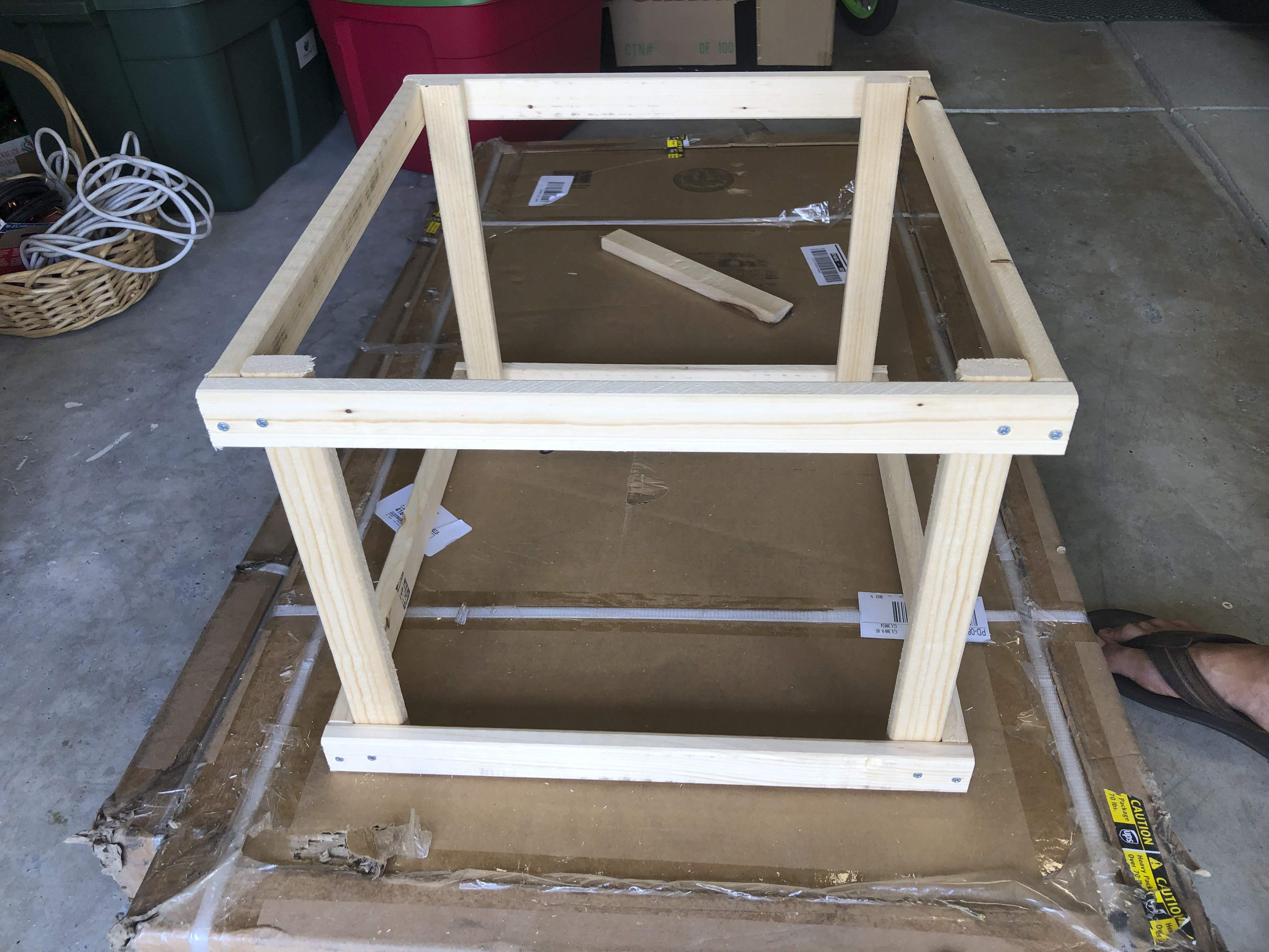 Cut your 1 x 2 furring strip boards after measuring your printer. You want to account a few inches around the perimeter so that your printer has plenty of space. It’s better to build too big rather than too small. I attached the corners of the 1 x 2s and 4 posts with screws to ensure a solid frame. You want to create a cube around the body of the printer with the vertical posts on the inside part of the top and bottom squares. Remember to create a cube tall enough to fit the width of your slats!