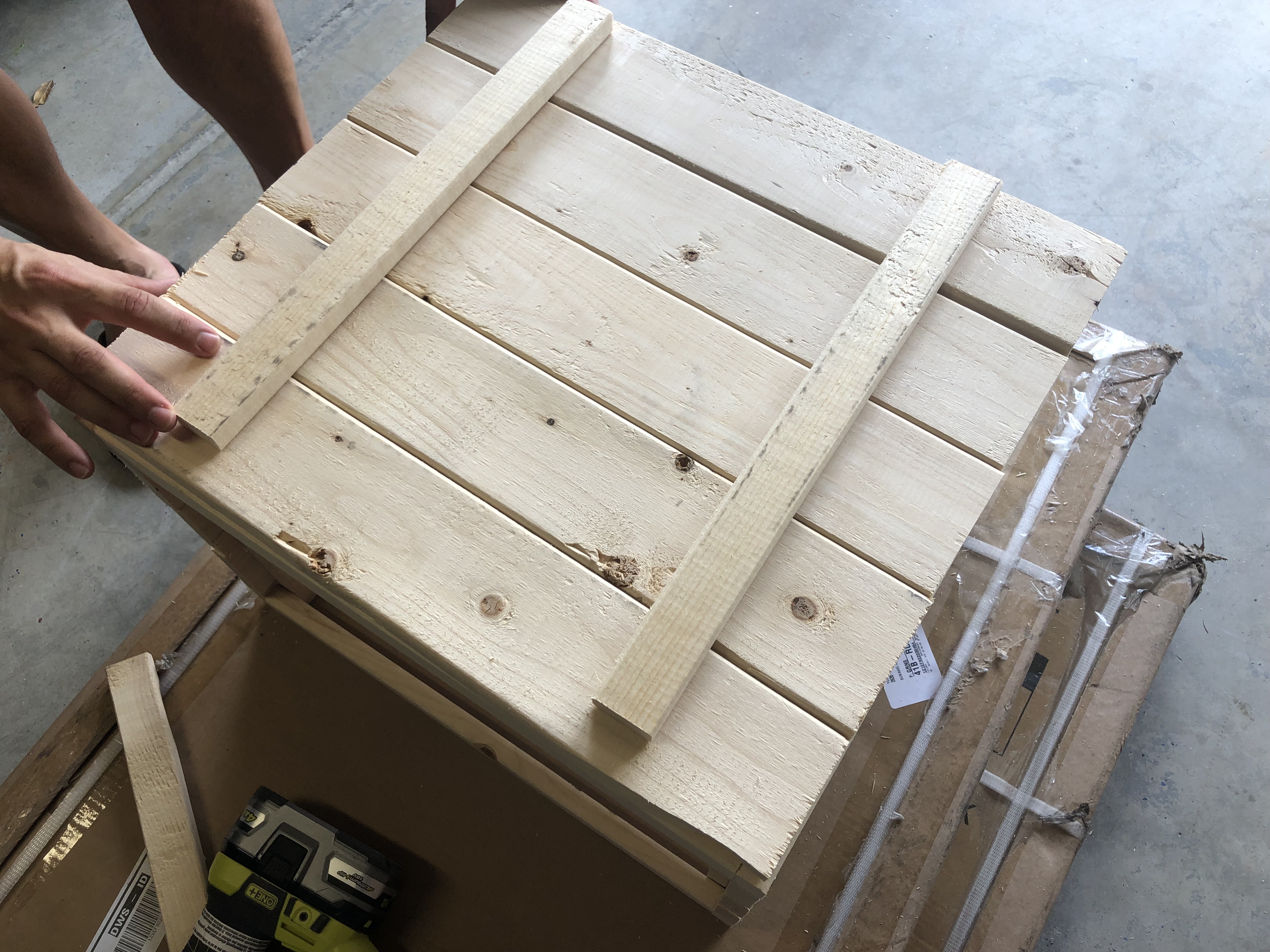 Remember to leave a gap from the end of the 1 x 2s and the edge of the panel so you have space for the hinges and so it will sit flush with the frame when closed. Also, leave a slight gap between the edges of the slats of the front panel and frame so it can easily open and close.