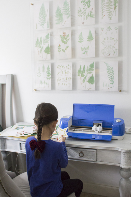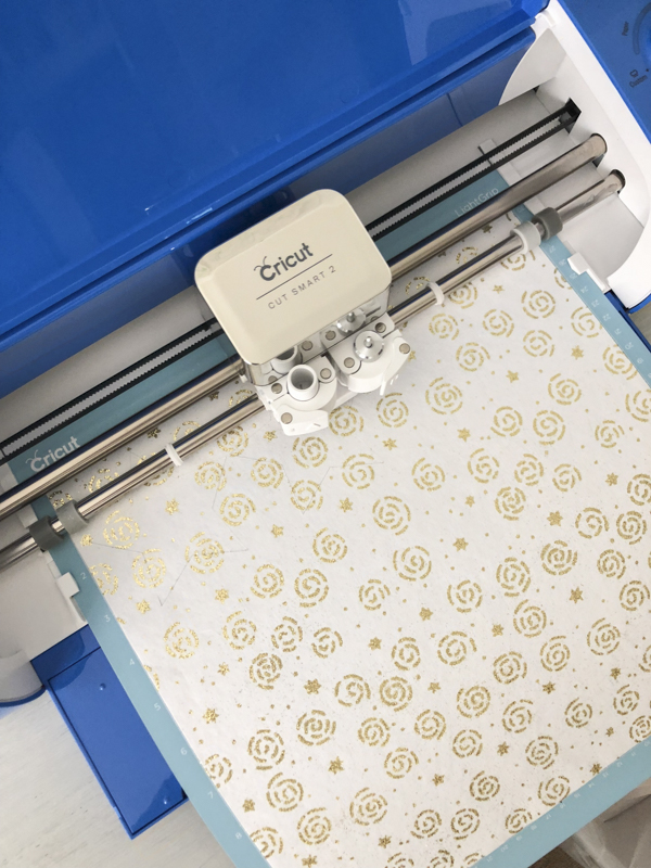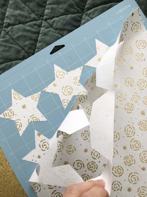 You lay the paper on top of the blue mat that has a sticky surface. They both glide into the Cricut machine and voila. All the stars are cut and all you have to do is peel! I can’t believe how easy it is.