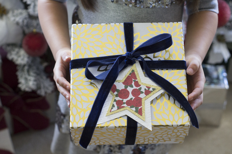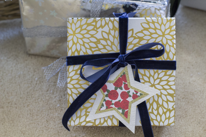 We glued different sizes of stars on top of each other to create a layered look and punched a hole at the top. I just tied it with pretty velvet ribbon. We used the back to write a lil message to our recipients to enjoy the yummy goodies we made for them.
