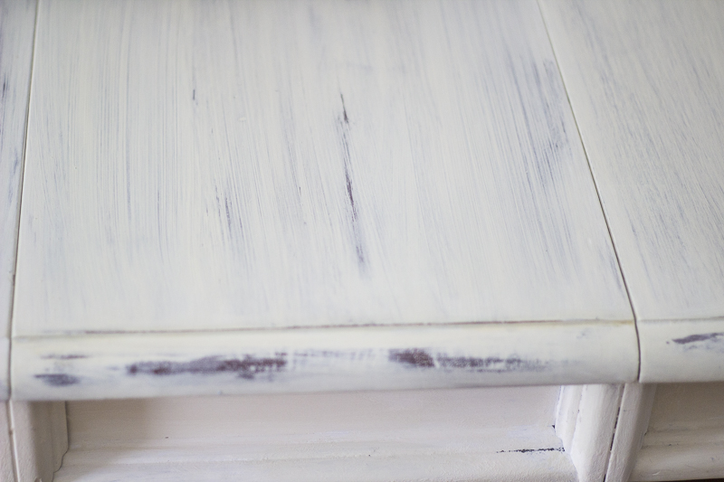 I was going for a white wash sort of look on the table. However, mine wasn’t going in that direction so I went with a different plan. I wanted it to be painted cream with some of the original dark wood stain peeking out creating a more rustic and aged look.