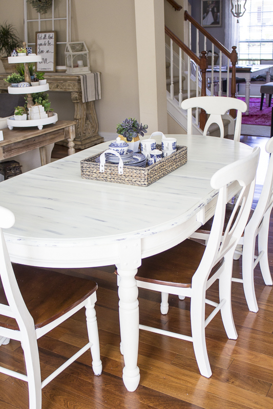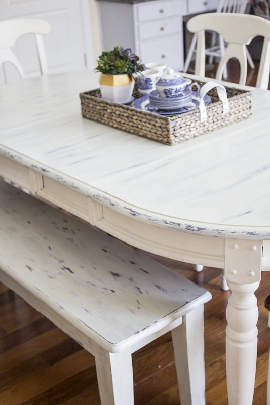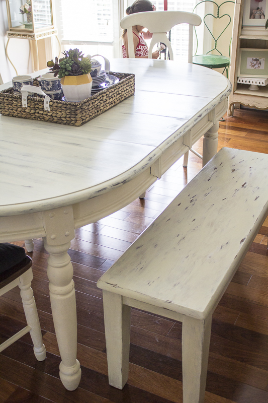 Since I don’t have the photos during the process, I’ll just share what I did. I started doing one section at a time by painting it with a linen color chalk paint. I believe I used Annie Sloan. While wet, I took an old cut up t-shirt and rubbed the paint vertically back and forth to create streaks. This will naturally take some of the paint off which was done on purpose. After finishing the sections, I got out a large bowl of water and one of those non-scratch Scotch Brite dish sponges. After wetting the sponge, I took the blue rough side and vertically went back and forth forcing some of the paint to come off. This allowed some of the dark stain to show through. I gave the table a good day to dry and then gave it 3 coats of clear polyurethane. This helps to seal and protect the table so that you can easily clean it after each use in the future. This step is crucial for furniture that needs to be constantly wiped down.