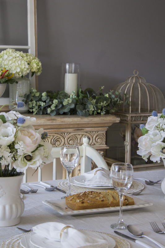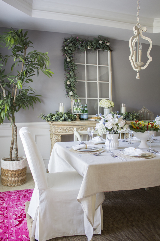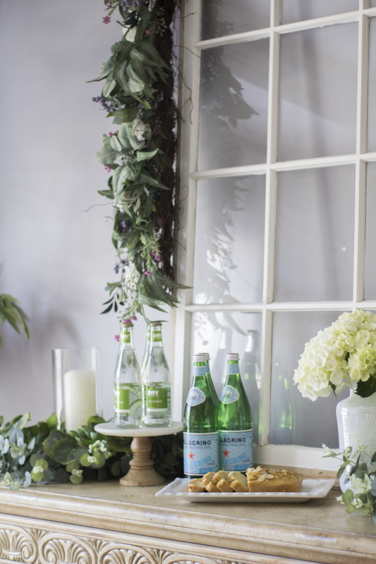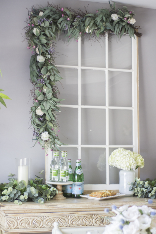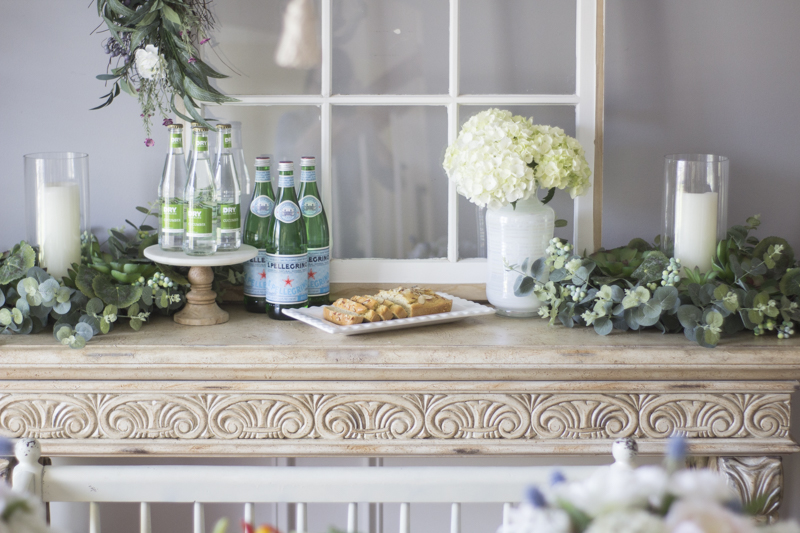 I love how greenery can act as a neutral color. The console table holds some beverages and some baked paleo almond bread for our brunch.
