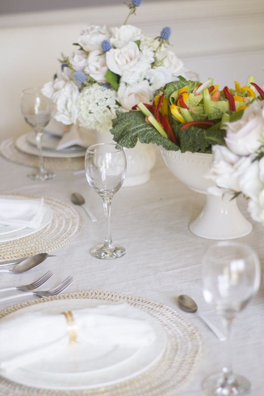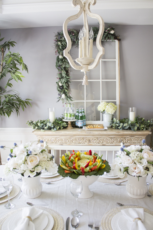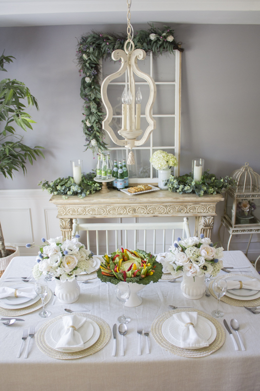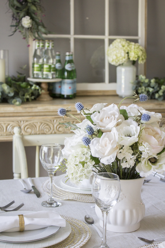 I put together a neutral tablescape and decorated it using some beautiful pieces from the Balsam Hill line. Balsam Hill is known for making high quality faux flower arrangements and I chose a pair of these white chantilly lace centerpieces and placed them on the table. The great thing about these centerpieces are that they last forever and because they’re neutral, they can coordinate with different holidays and events.