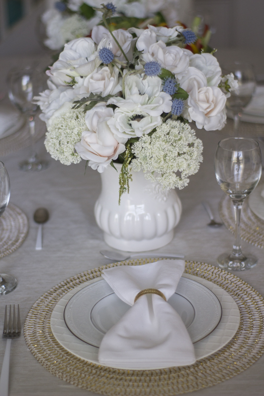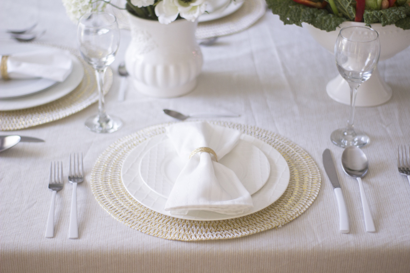 Using white plates keeps the table neutral and classic. Simple white napkins are placed on top of the plates and the gold and white shimmery placemats act as a charger.