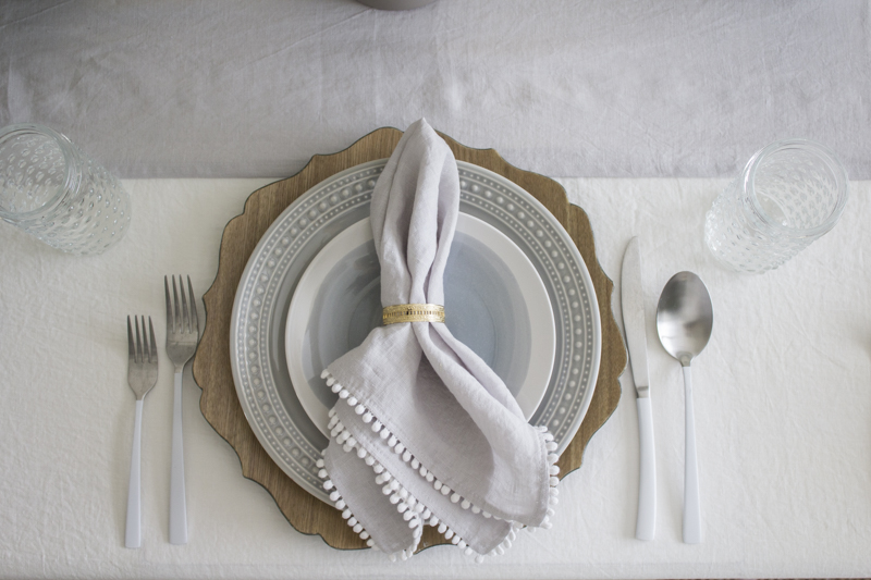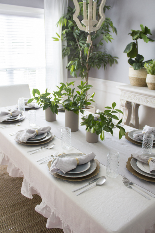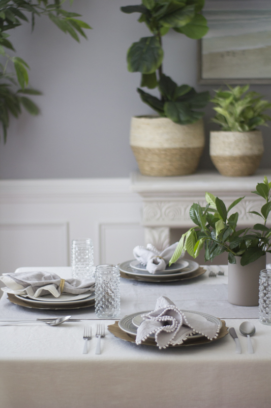 They were generous to let me choose pieces that I could use for my transitional tabescape. It was all so beautiful but I ended up choosing their ruffled tablecover, linen napkins with pom poms and a gray linen runner. I thought they would make the perfect transitional tablescape.