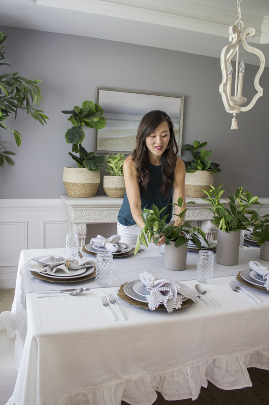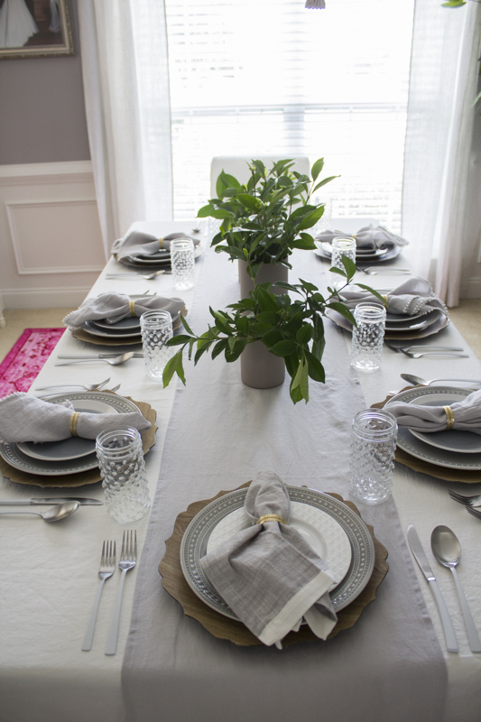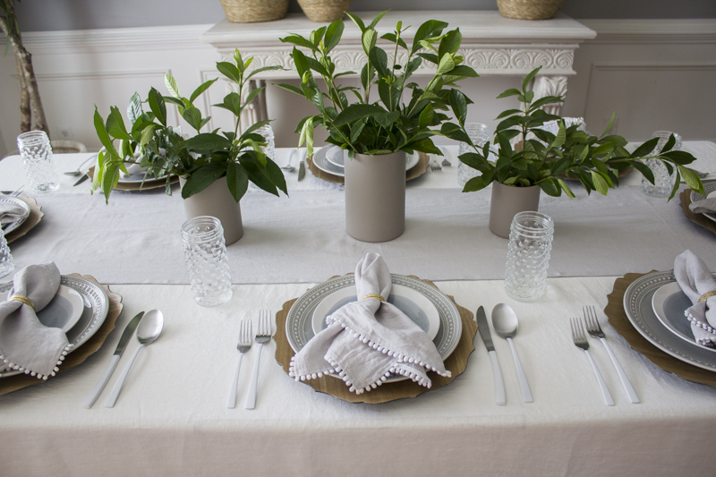 For the centerpieces, I just clipped fresh gardenia leaves outside and added them into these gray canister containers. Simple and natural was my motto for this tablescape. You don’t always need to buy fresh flowers. Just take a look outside your doors.