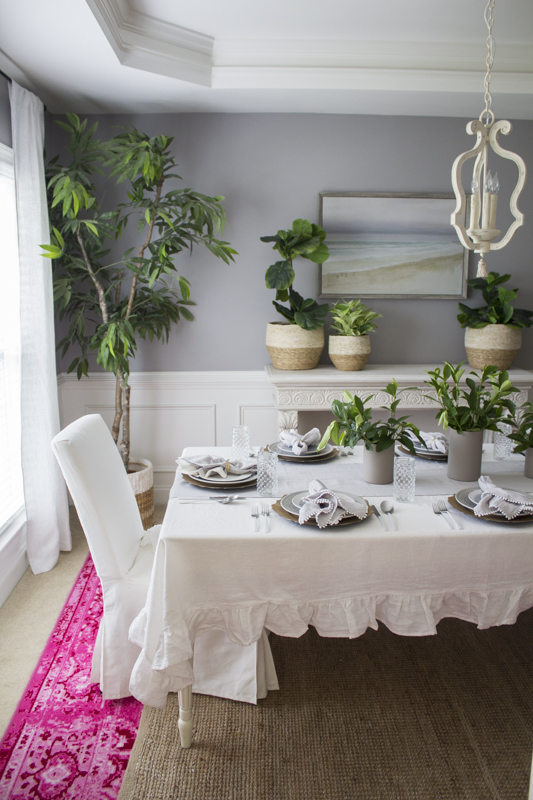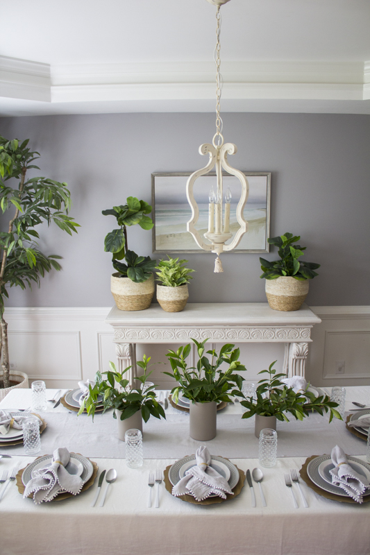 I recently painted over that large stone console table in the back and added the art and plants. I love how these simple changes really transformed the vibe of this space. It feels really peaceful and the mix of the colors and plants add a new life to this dining room. Sometimes, shopping around your home and moving things around can offer a fresh change of scenery.