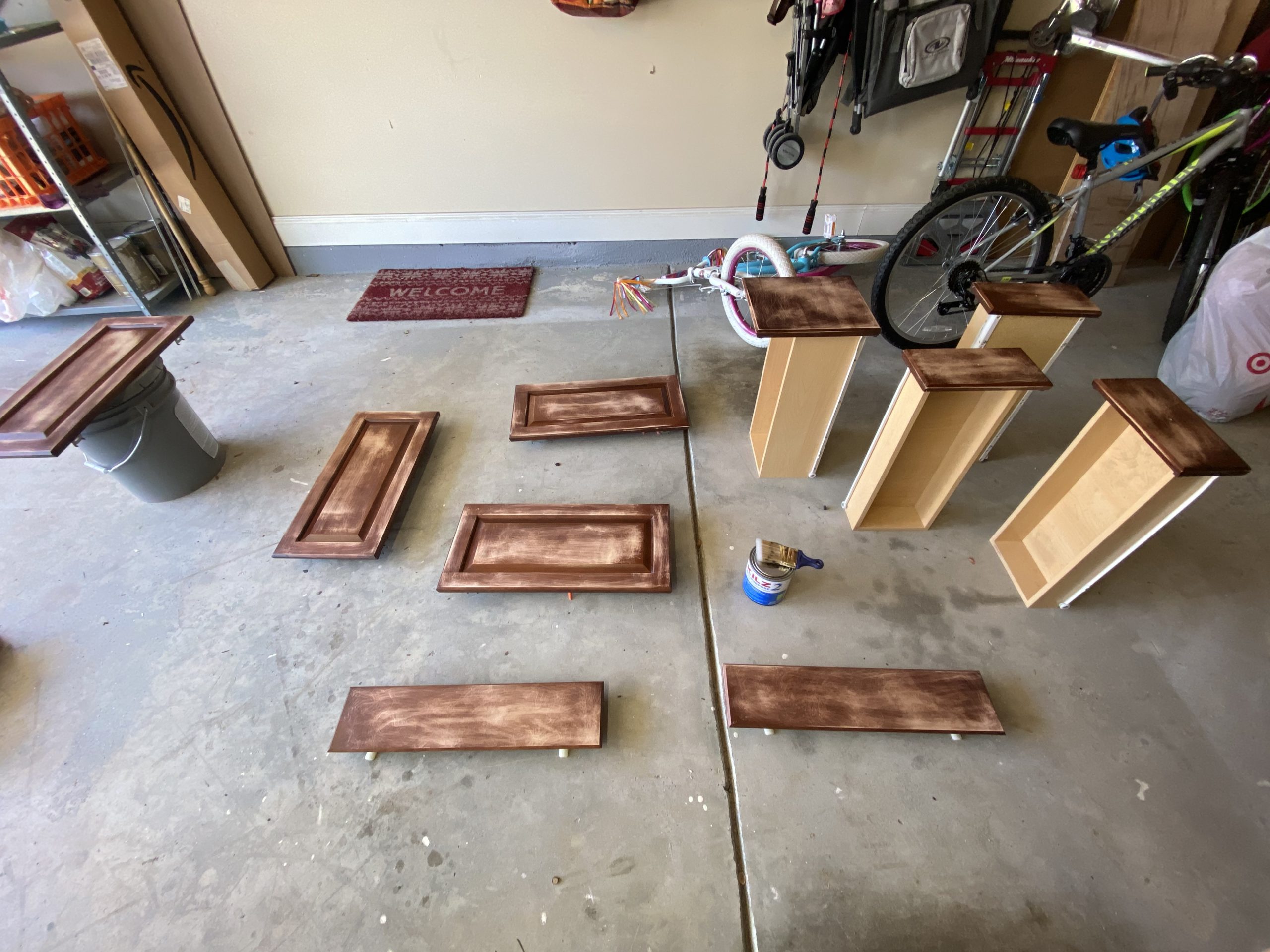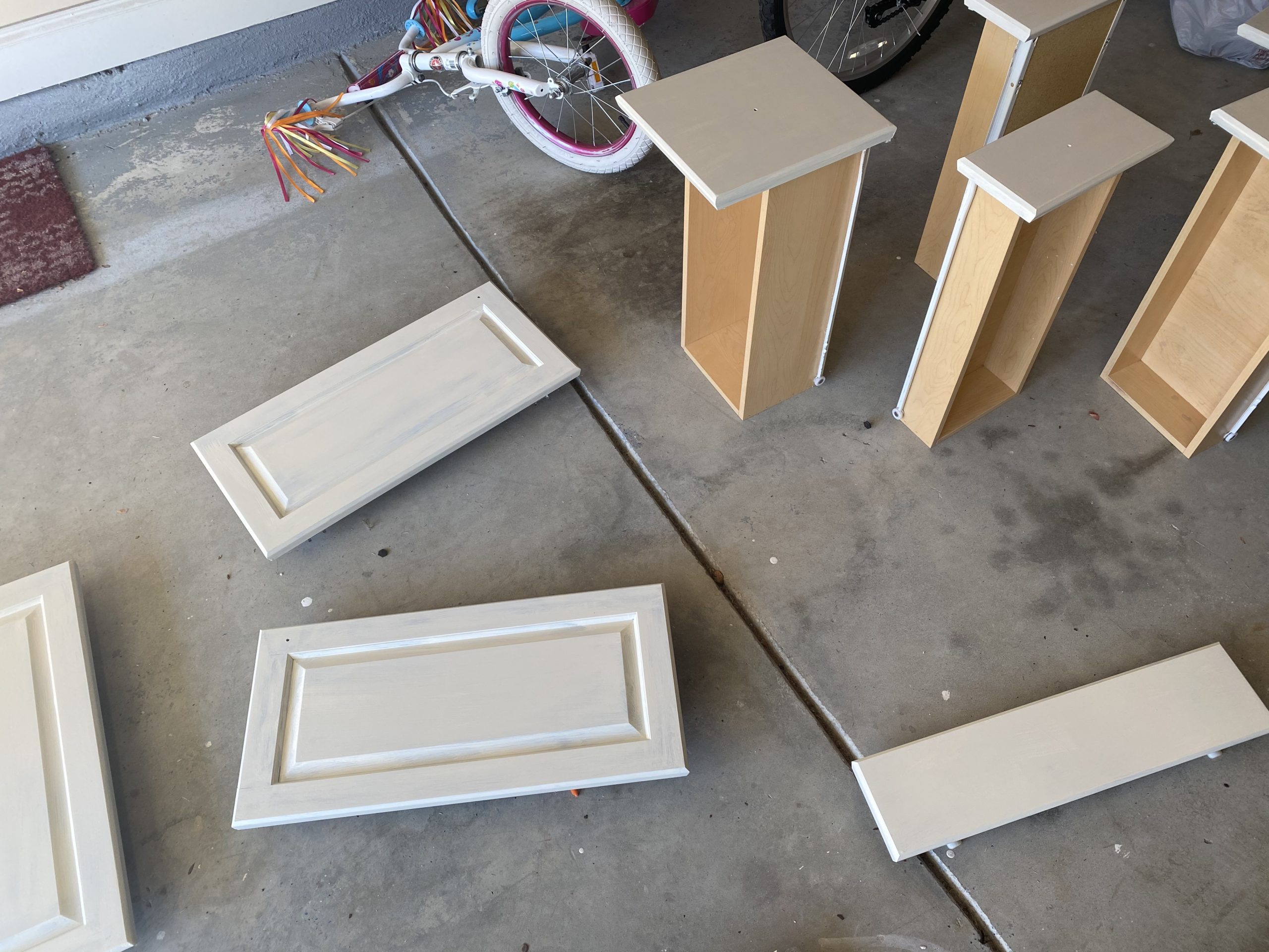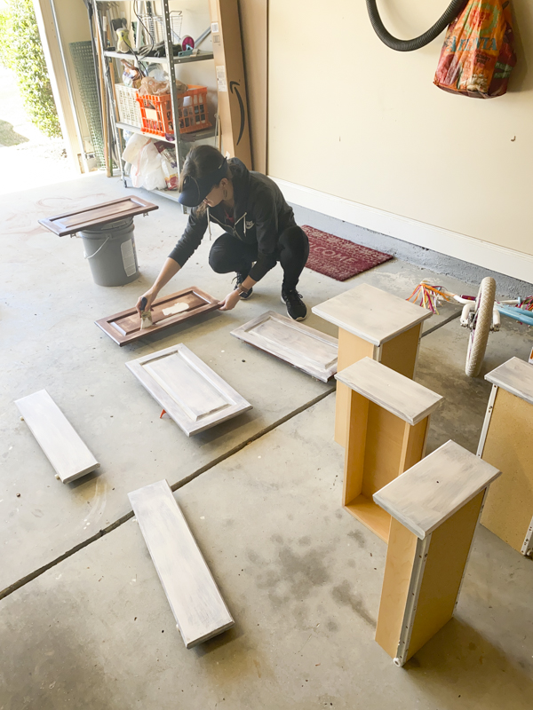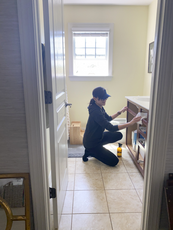 I wiped down the cabinets with a simple vinegar cleaner. I removed the hardware, cabinet doors and drawers. I left the hinges on.