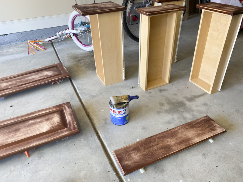 Step 3: Use KILZ primer and paint a layer onto the cabinet doors and drawers.