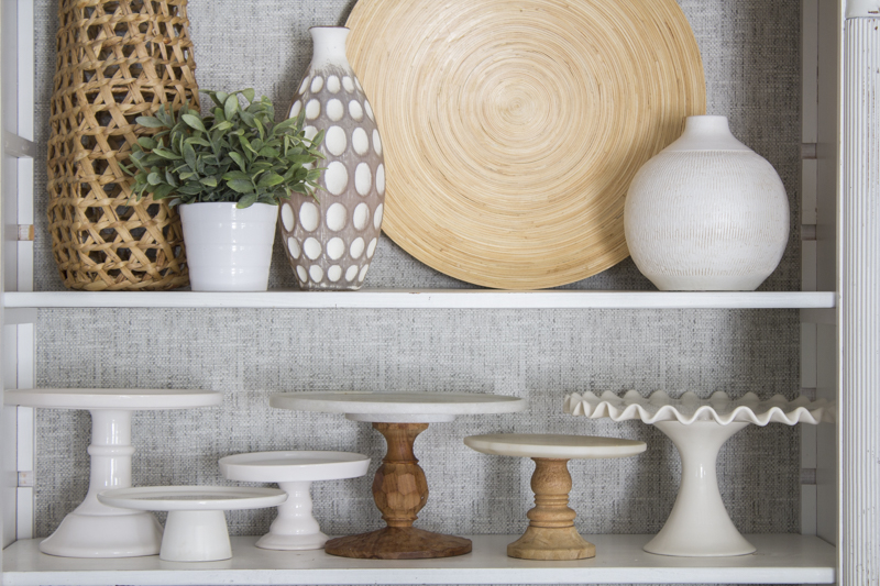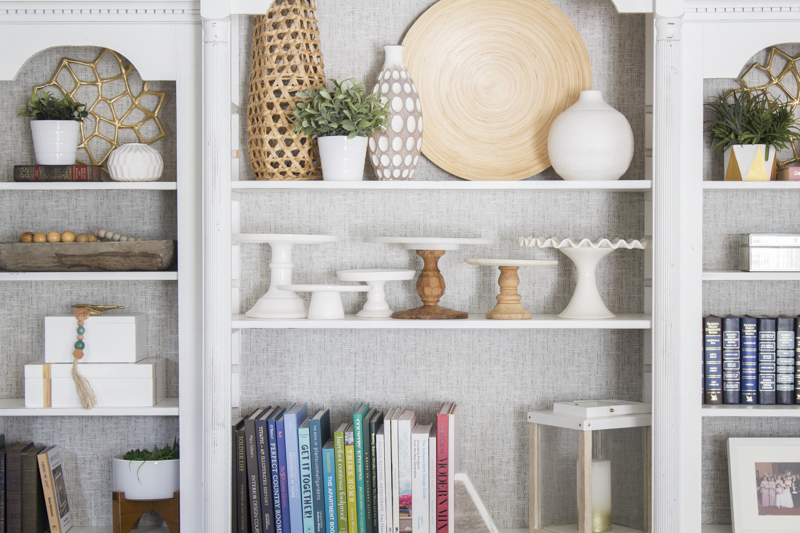 Do you have a bookcase that could use a little update? Even though the bookcase that I used for this project isn’t that old, I really wanted to change out the farmhouse look on the back of the shelves. I know the shiplap look is still super popular right now but since it’s not really me, I wanted to get rid of it without painting or doing anything crazy to it. Here’s how to jazz up your bookcase with wallpaper in a quick and easy way.