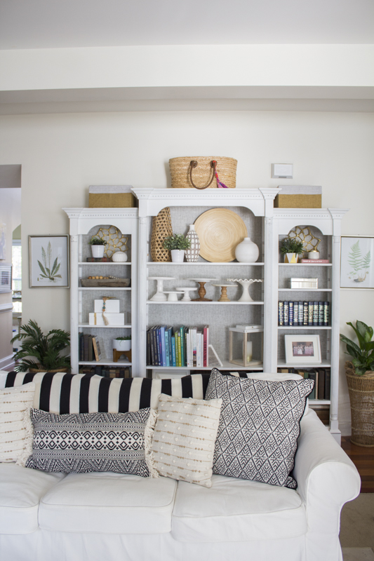 I’ve been playing with painting the back of my trio of bookcases a dark color but I kept resisting the idea because I didn’t want to mess it up in case I hated it in the end. I know it could always be repainted but since I didn’t know it’s original paint color, I didn’t want to take the chance that I would have to paint the entire bookcase in the future. It’s a really beautiful set and it was bought at the Atlanta Market many years ago. Sorry I can’t give you any sources on it!