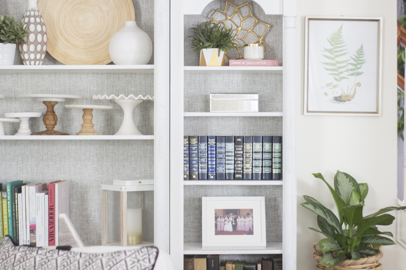 Hey friends, it’s been a super crazy 2 weeks as my husband and I just got back from an epic trip to Italy with our friends and then I had a work trip immediately following after that. Both trips were amazing and I have so much to share regarding those trips so those posts are coming soon. I’m so behind on blog posts because I just haven’t had the time to write them up. The struggle is that I always have way more content than the time to share them all. However, I have one available today! This post is all about how to jazz up your bookcase with wallpaper.