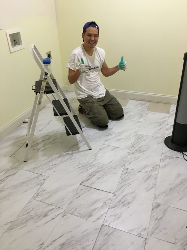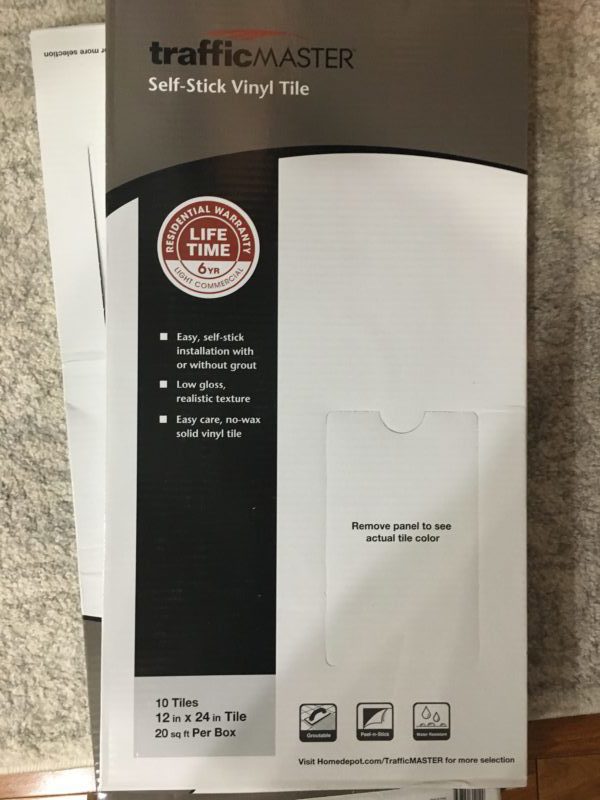 It comes in a box of 10 linoleum tiles and we bought and used exactly 3 boxes. You guys, it’s PEEL and STICK tiles! It’s for lazy DIY people like me and it is a dream to install. It’s easy to cut bc you just need a sharp utility knife to score the tiles. We decided to grout in between the tiles to give off the appearance of real tiles. I added grouting to my DIY checklist last week! Look at my husband looking all happy and skinny! #paleoishlife This picture is before we grouted in between the tiles.