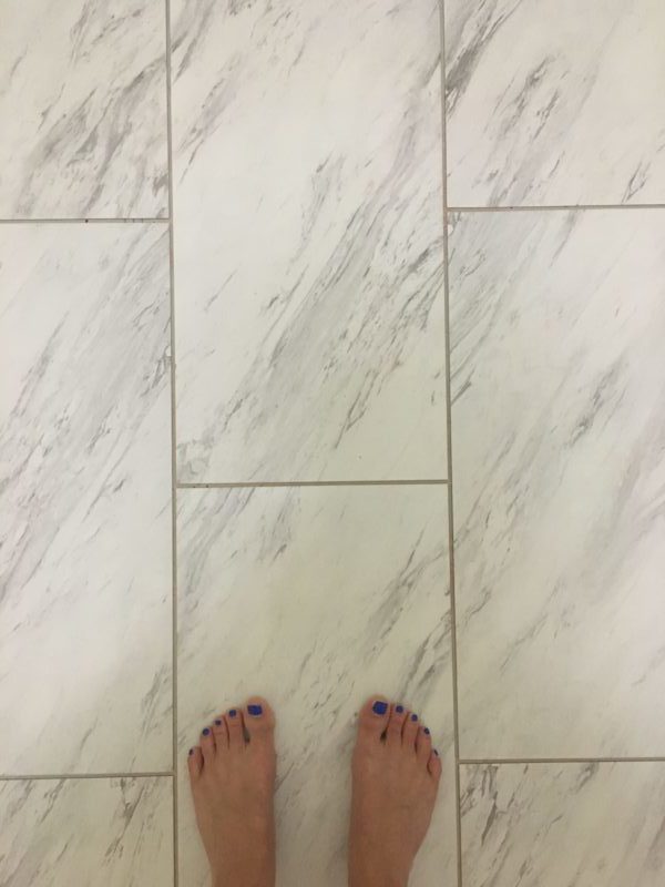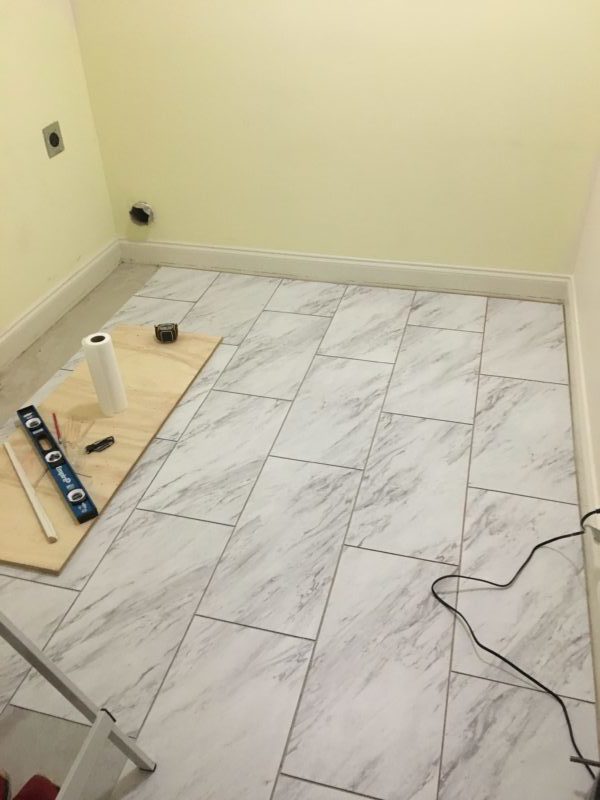Here are a few progress shots. I will be sharing a video tutorial soon on how to install these tiles. If you’re looking to replace flooring in a bathroom or laundry area, I highly recommend this. One of the things I liked about this tile is that it’s not cold on your feet and super easy to clean.