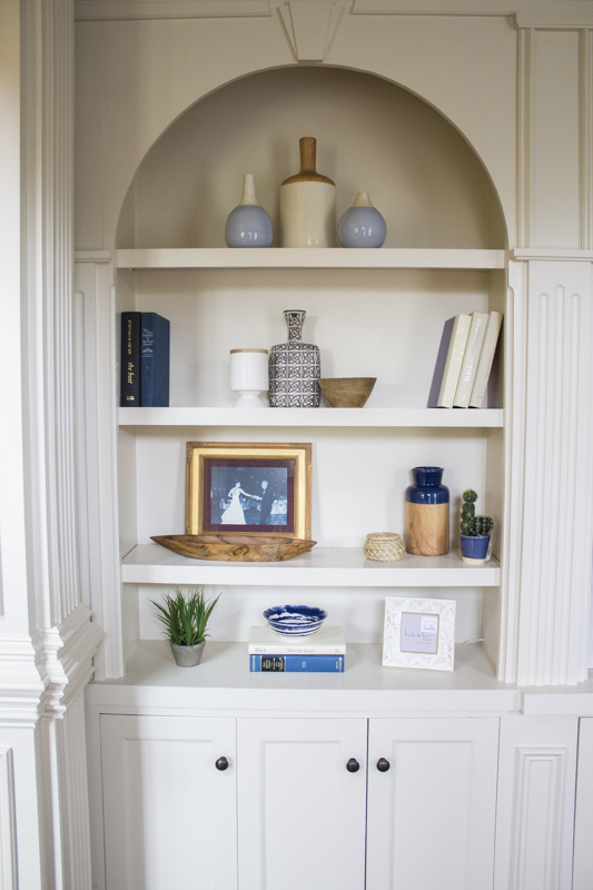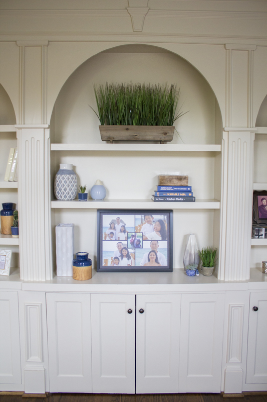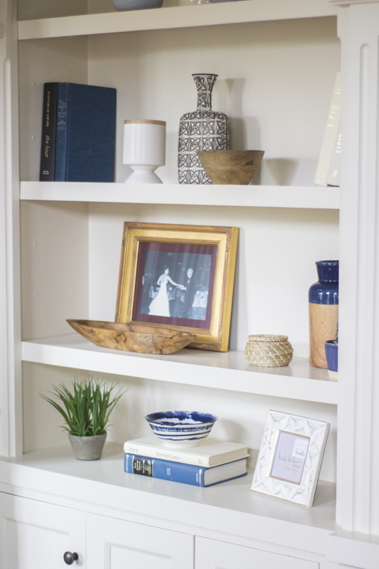 I kept the palette with different hues of greens and blues on the shelves. I used some existing frames and decor on the shelves mixed in with new ones. I also took some old frames and created a gallery wall in their powder room.