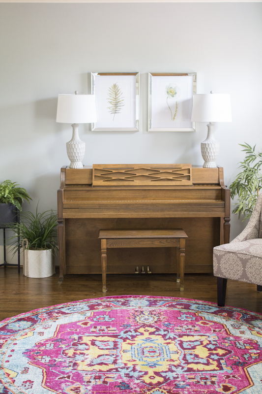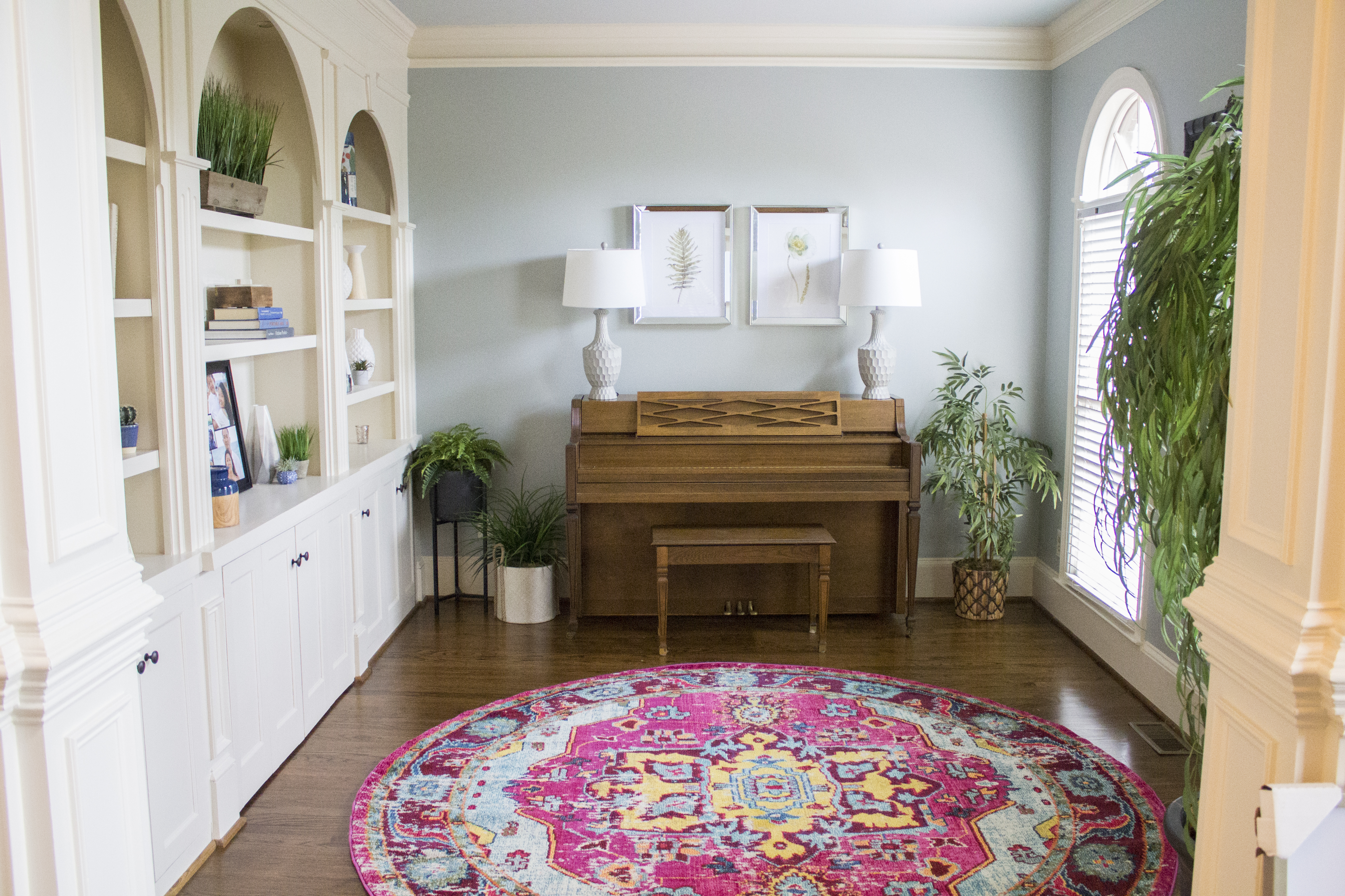 What a huge difference it made bringing in the round rug and plants. The room looks much more homey and inviting. I would take it one step further and bring in four chairs to sit around the rug for piano listening in some cool colors like the rug. Just curious, did you put the settee in another room?