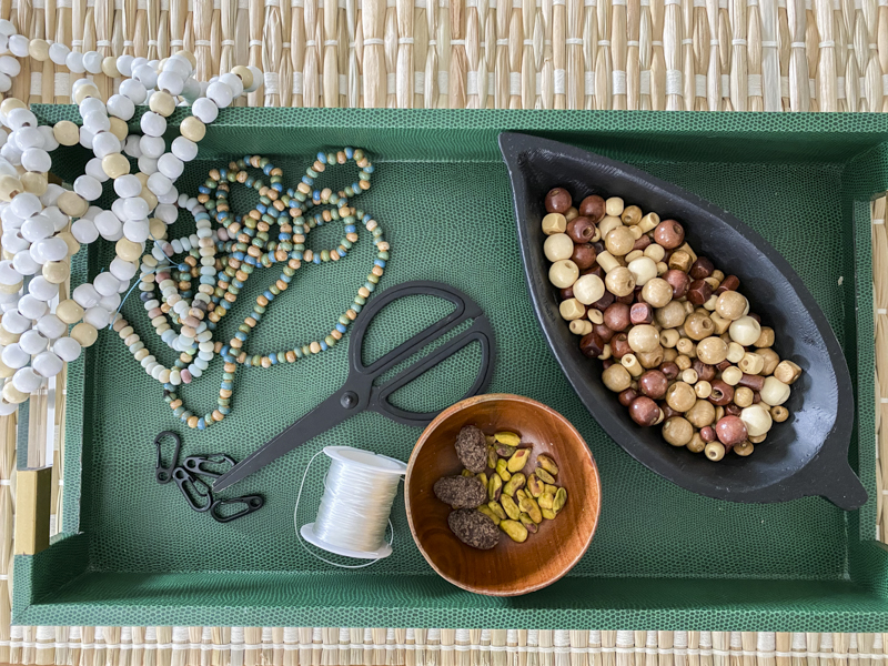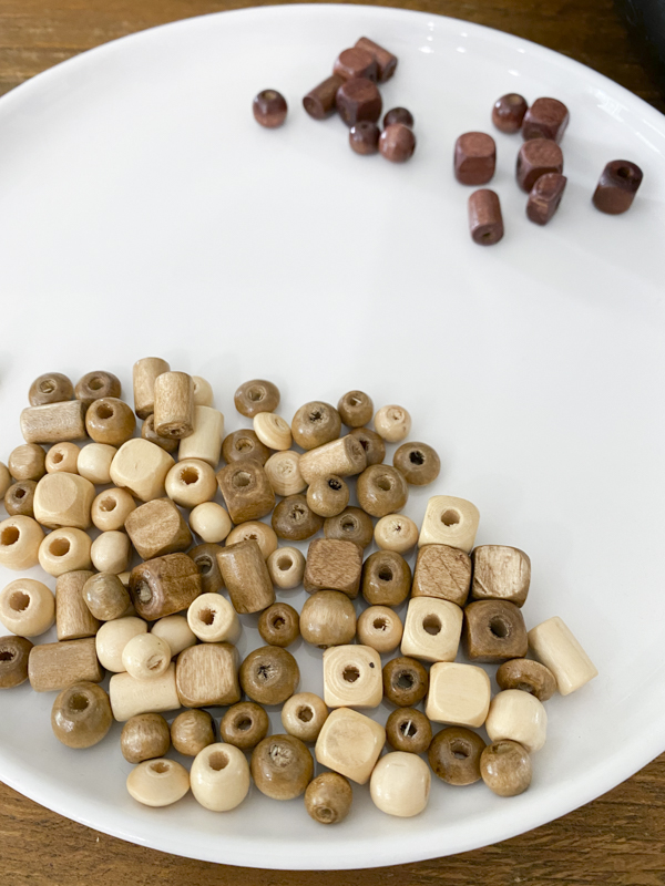 The easiest and most resourceful way to make these is by taking an old necklace and cutting them. All you have to do is add the clasps. That’s how I made the first few and then I decided to buy some small wooden beads from Walmart in the craft section. This also makes the perfect craft project to do with kids.