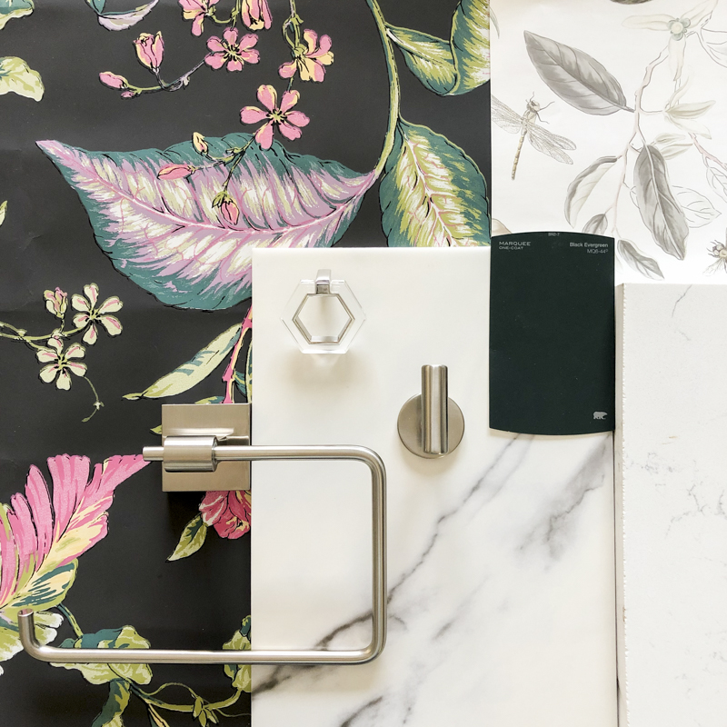 Last week, I shared my design board. Well, I made a tweak and came up with a new board. The main change I made was the color of the cabinets. From the start, I kept going back and forth from periwinkle and a dark rich green. I finally decided on the green because I think the contrast with all the whites in the bathroom will really complement each other. Plus, I tend to always move towards a rich, moody color.