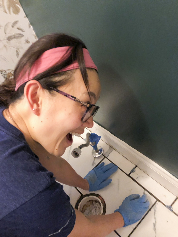 Jimmy made a circular cut on the tile using the angle grinder for the toilet area. During this week, he ended up having a really bad allergic reaction in his eye. I suspect it was all the demo dust especially with using the angle grinder and tile saw. I also had a toe injury which resulted in stitches. Nope, not even from the renovation. I dropped my daughter’s computer on my pinky toe. Fun times! Let’s just say the people at urgent care didn’t know who needed care after taking a look at both of us. Ha!