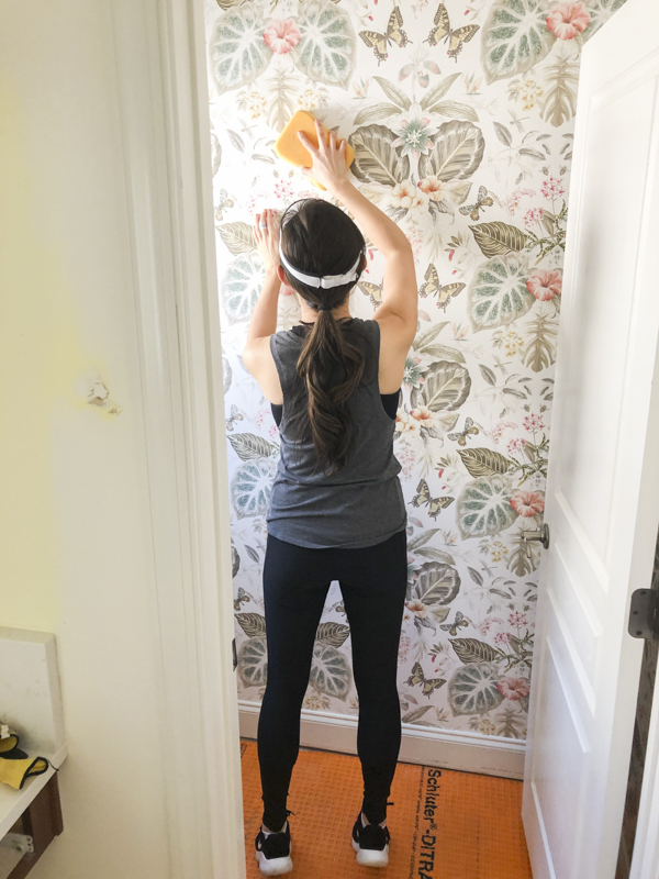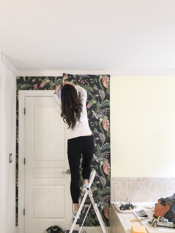 This past week was the busiest one where I spent a lot of time every day in the bathroom getting things knocked off the checklist. Since there is officially only one week left, we were busy installing the wallpaper, painting cabinets, grouting the tiles, installing hardware and new lighting.