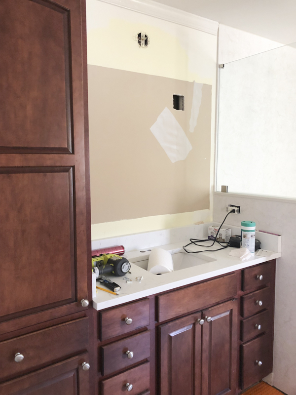 Don’t you just love surprises like discovering big holes on walls? We saw this when removing the large mirror. Looks like more dry wall patching is in my future!