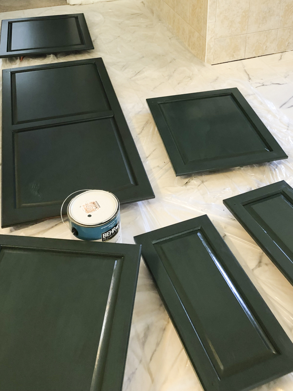 I removed all the doors so I could get into the edges easier. The new hardware looks absolutely gorgeous and totally makes the traditional cabinets look new and modern. Paint is always an inexpensive way to update your cabinets just like we did for our kitchen.