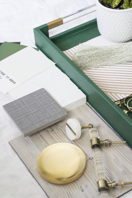 This is a great time to display your ideas for hardware and see how they look against the important elements like paint colors and flooring. The marble and lucite details on the hardware add the perfect classic and sophisticated touch!