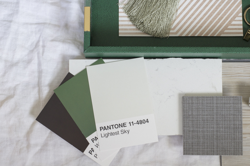 Brass accents add a stunning contrast to the bright green and modern tile and vinyl flooring. Seeing these objects together helps to create a cohesive design and allows you to visualize the colors together.