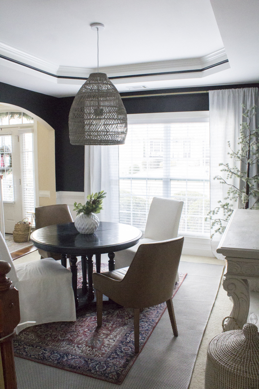 I don’t have another set of 4 chairs except in the breakfast area so I mixed two pairs in from around the house and I ended up really liking this mix with the rug.