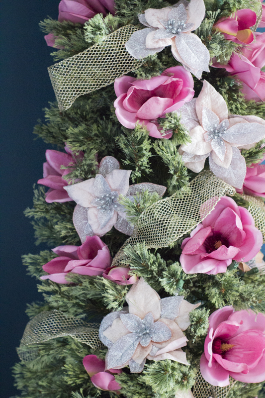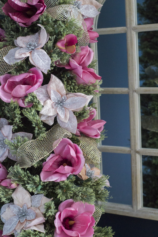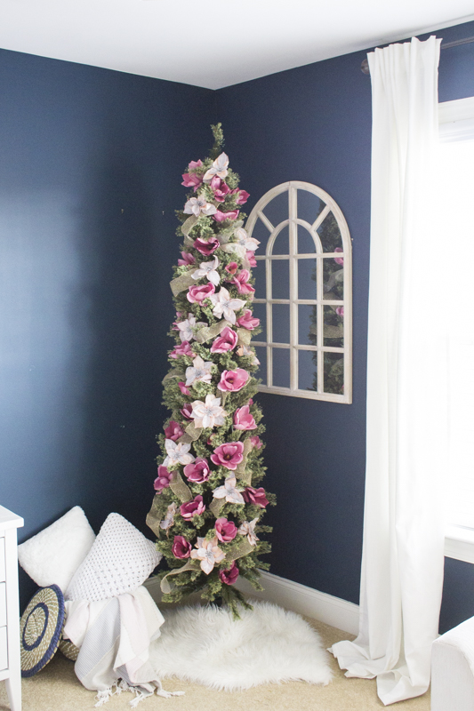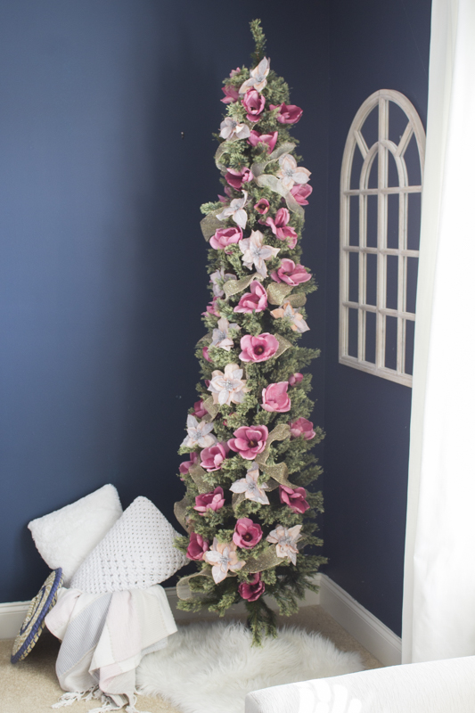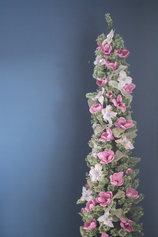 Yuni! I love the blue and pink together! That skinny tree is adorable, and I love how you use florals instead of ornaments! Perfect!! Great touring with you!! xoxo