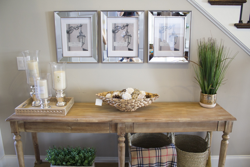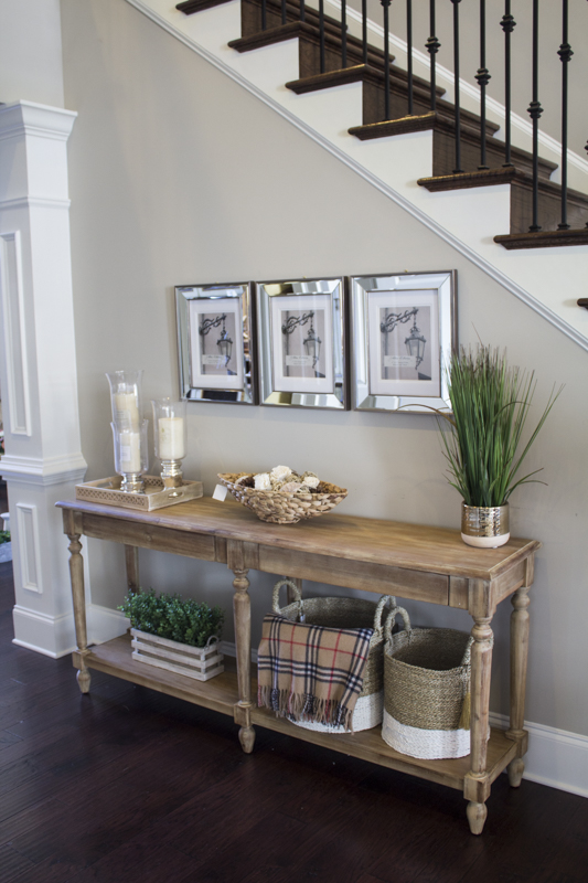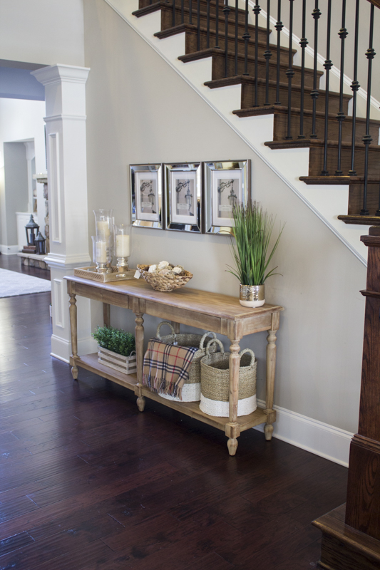 Right before Christmas, I was able to redo a foyer area for a friend and client. Lisa was never happy with her foyer space and it bothered her because she always felt like something was off. When I looked at the space, the main thing I noticed was that the current piece of furniture wasn’t the right size for the space. Her home is beautiful and actually has a double foyer so this nice space under the stairs is what you see before heading towards her living room, dining room and kitchen.
