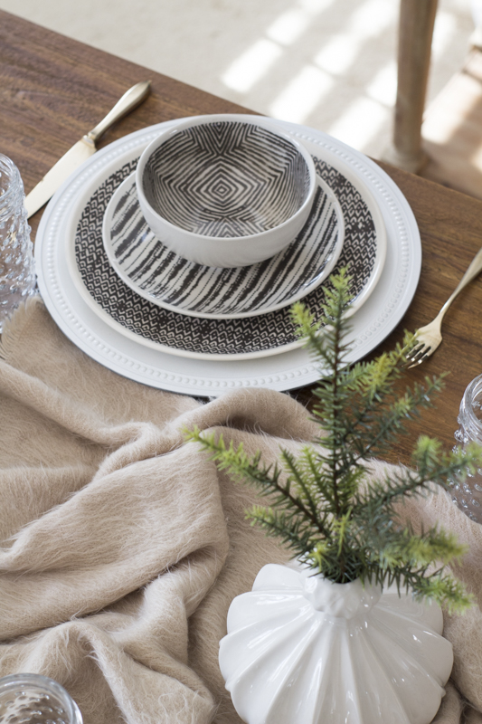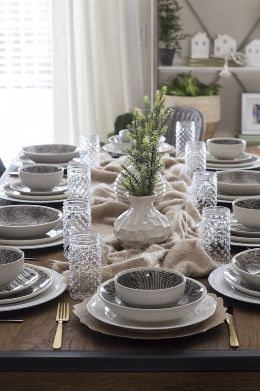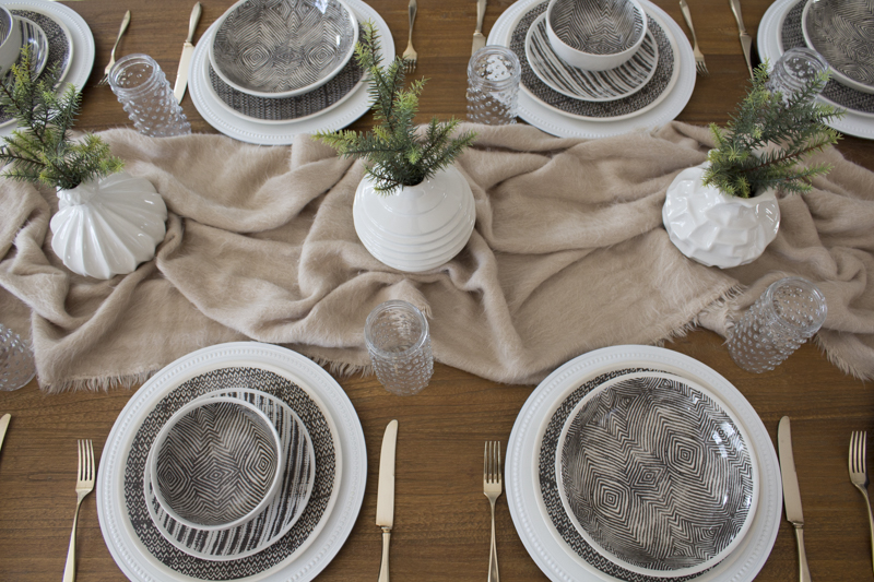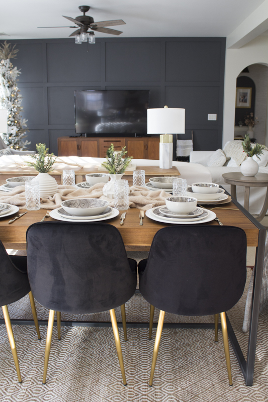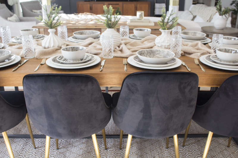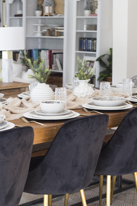 The 3 sculpted ceramic vases come as a set and are perfect for holding one simple faux stem. I like to keep any type of centerpieces or décor on the shorter side so that it doesn’t hinder anyone’s view while eating and conversing across the table.