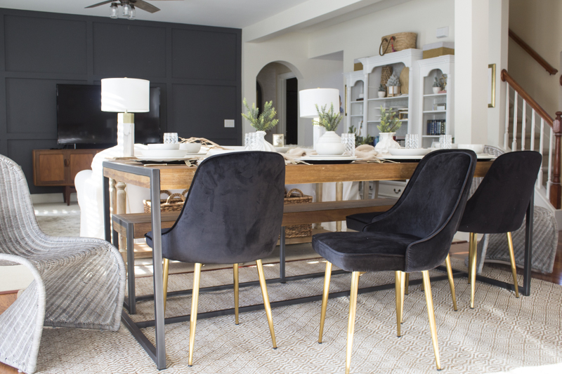 I decided to mix it up with some unique rattan chairs at the end and their shape drew me to the design. I love the curved shape and I chose gray ones to add a nice contrast to the industrial table. Wood and rattan look so good together and the combination of textures adds a nice organic element to the space.