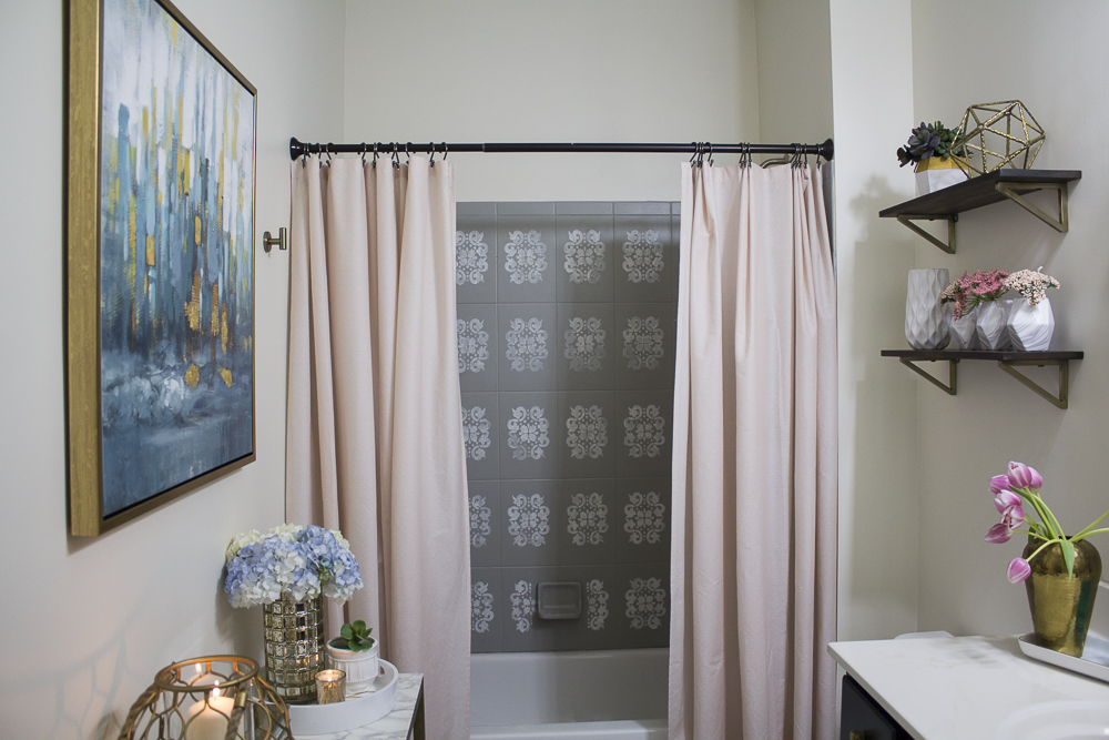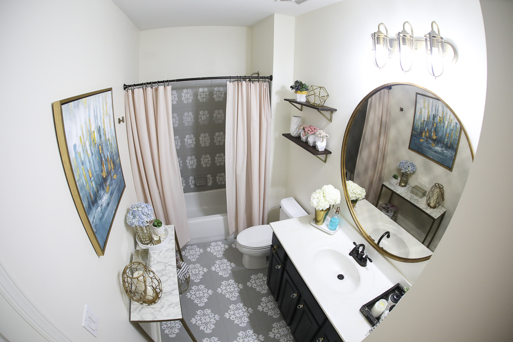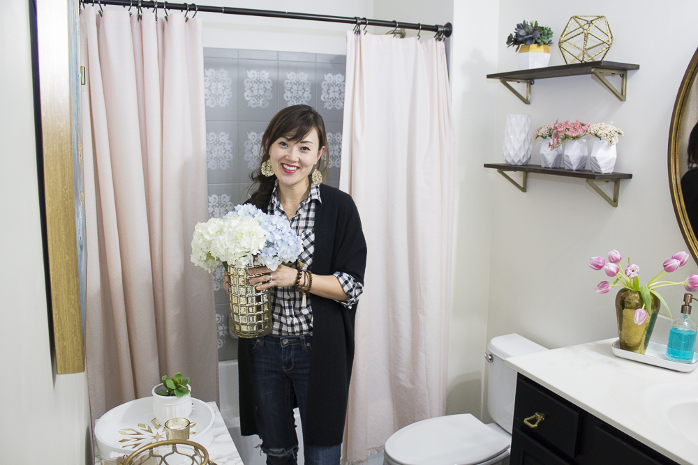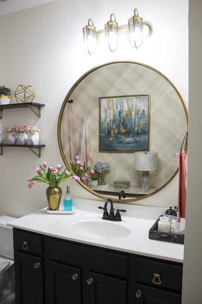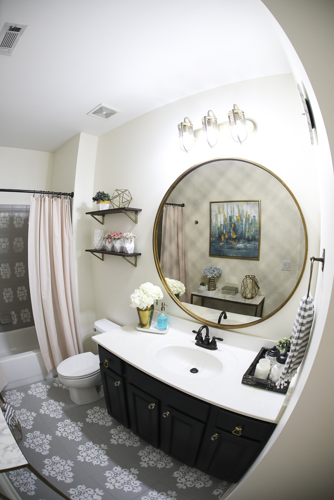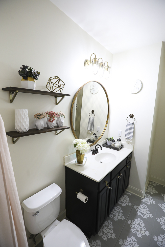So beautiful Yuni!! I think you just inspired me to paint my vanity black! I love that gold mirror and the tile! It’s all amazing. Great job my friend!