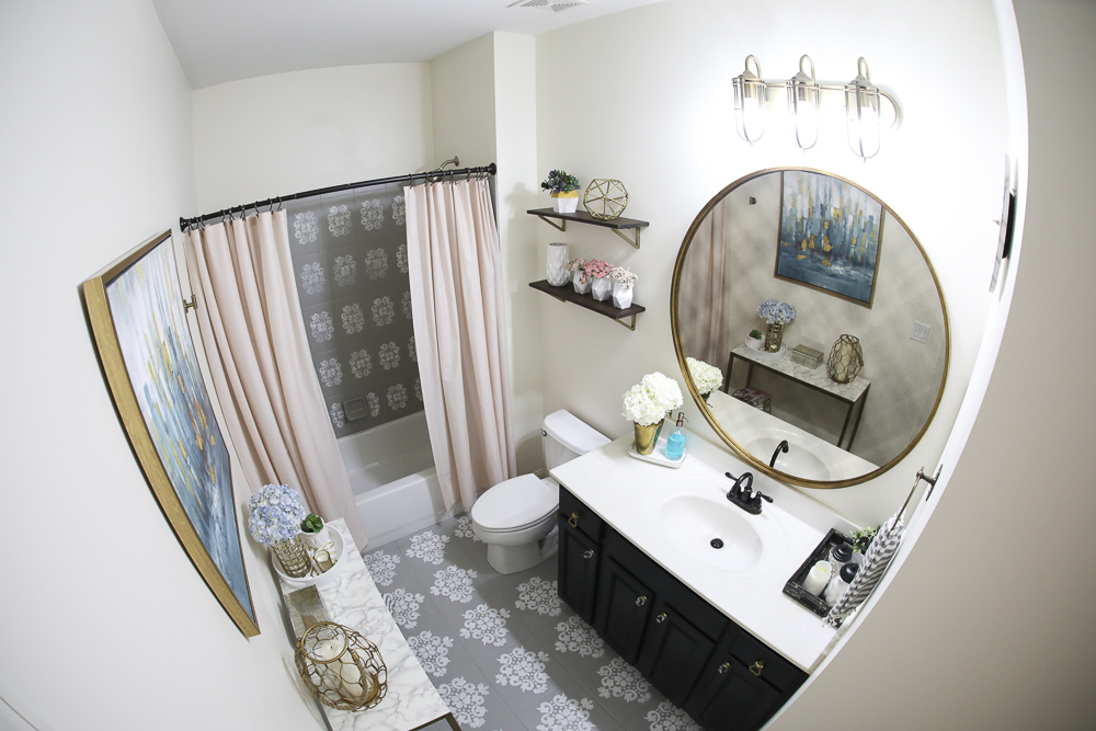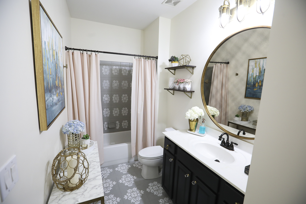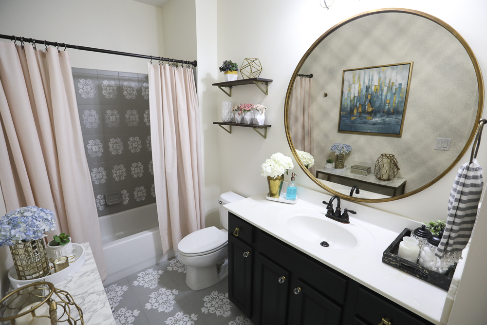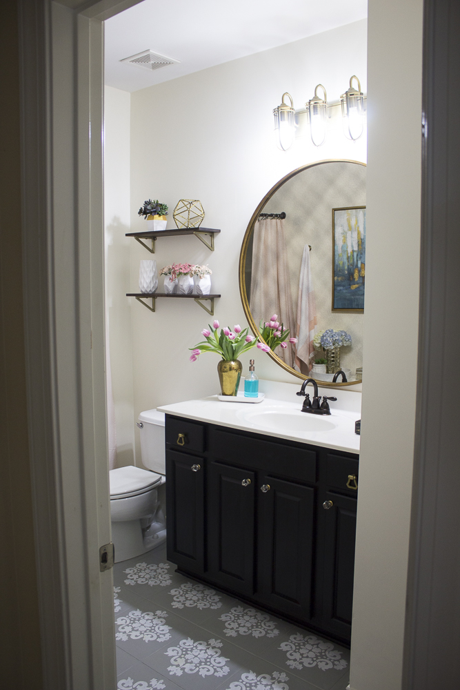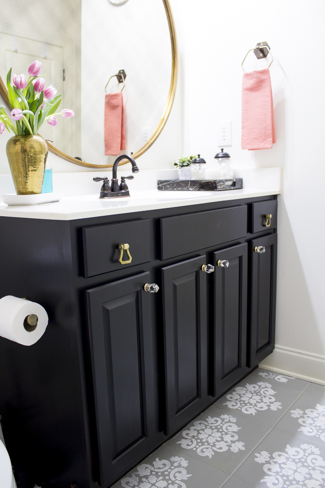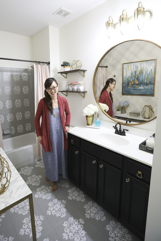 Yuni your bathroom turned out beautiful! The black vanity looks so good! I used those same gold pulls in my ORC makeover too :). The painted floor tiles are just wow! Congrats on a beautiful transformation.