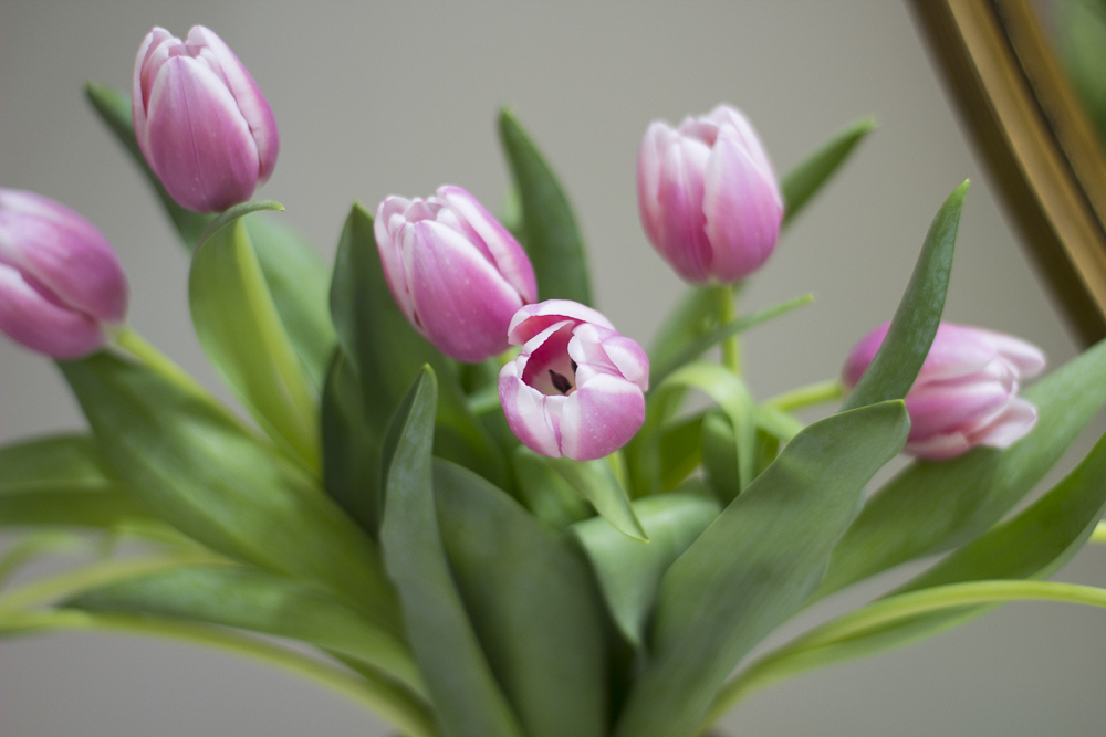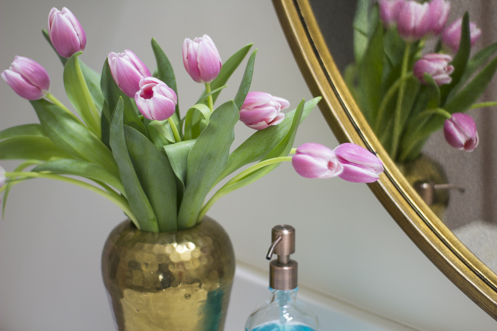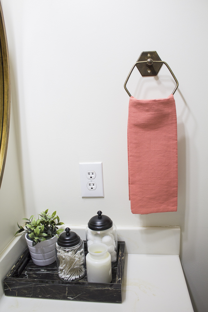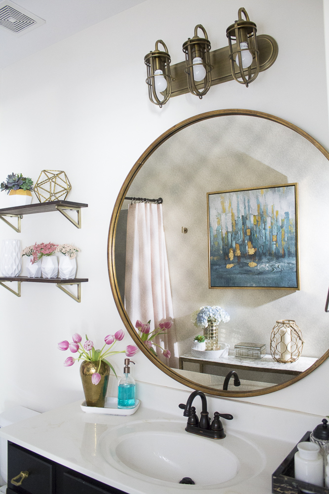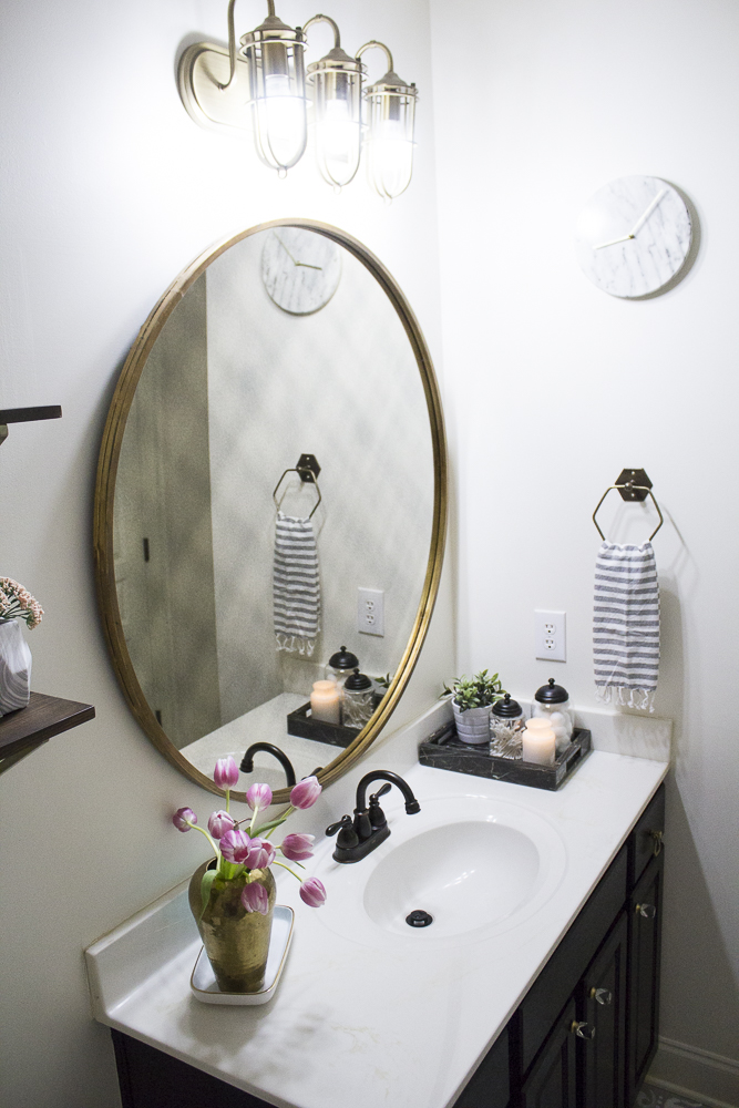 I really like all the accessories you chose for the space, especially the round mirror and geometric towel ring!