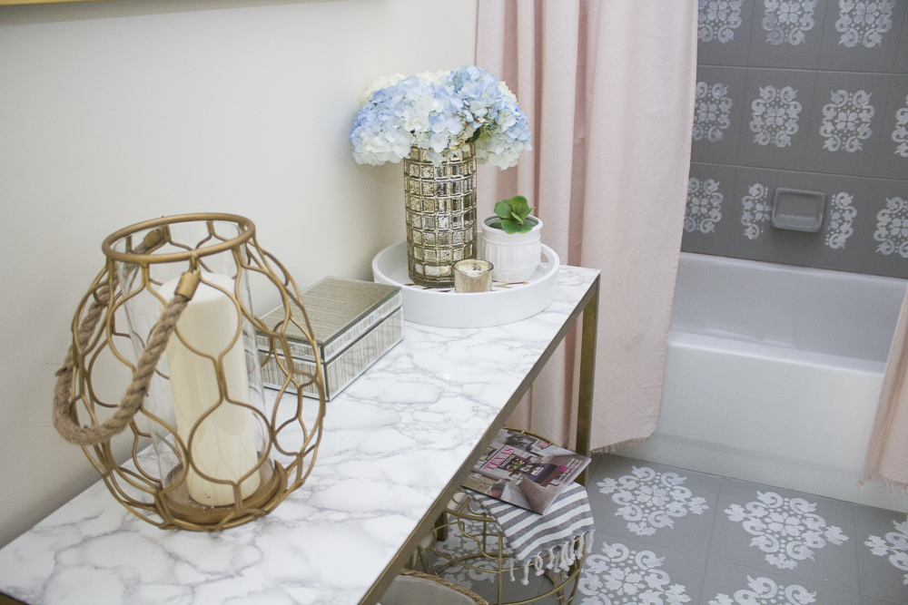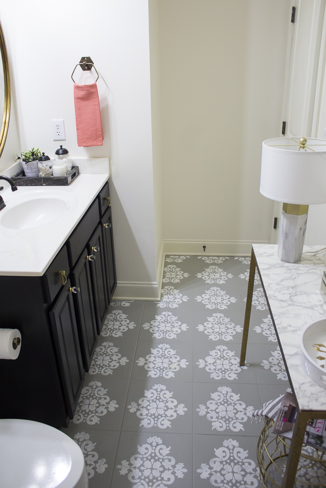 Wow! I am loving that gray stenciled tiles! That just makes the room! I also love the black on the vanity base – oh and that pink! So beautiful. I can’t wait to read your tutorial on how you painted your tile!