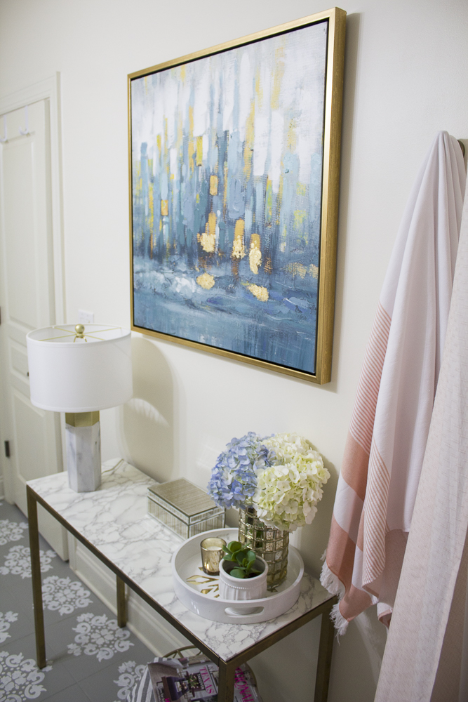 Your bathroom looks so pretty! I love the artwork and the painted tiles. What a great idea to use a console table in the bathroom. You have given me so much inspiration!