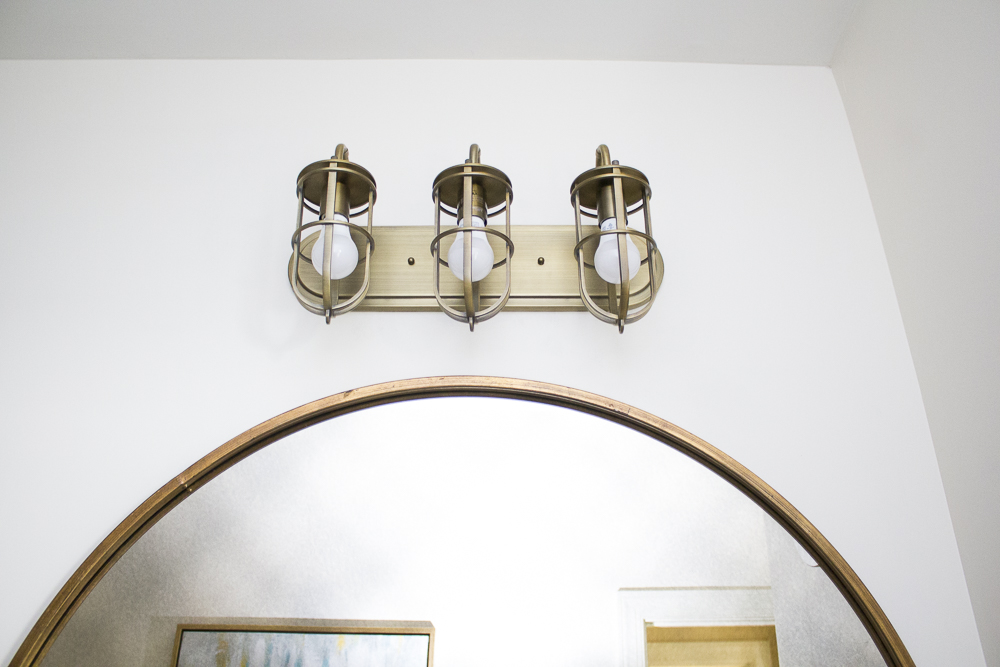 - Lighting Design: Wall mounted antique brass lighting above mirror