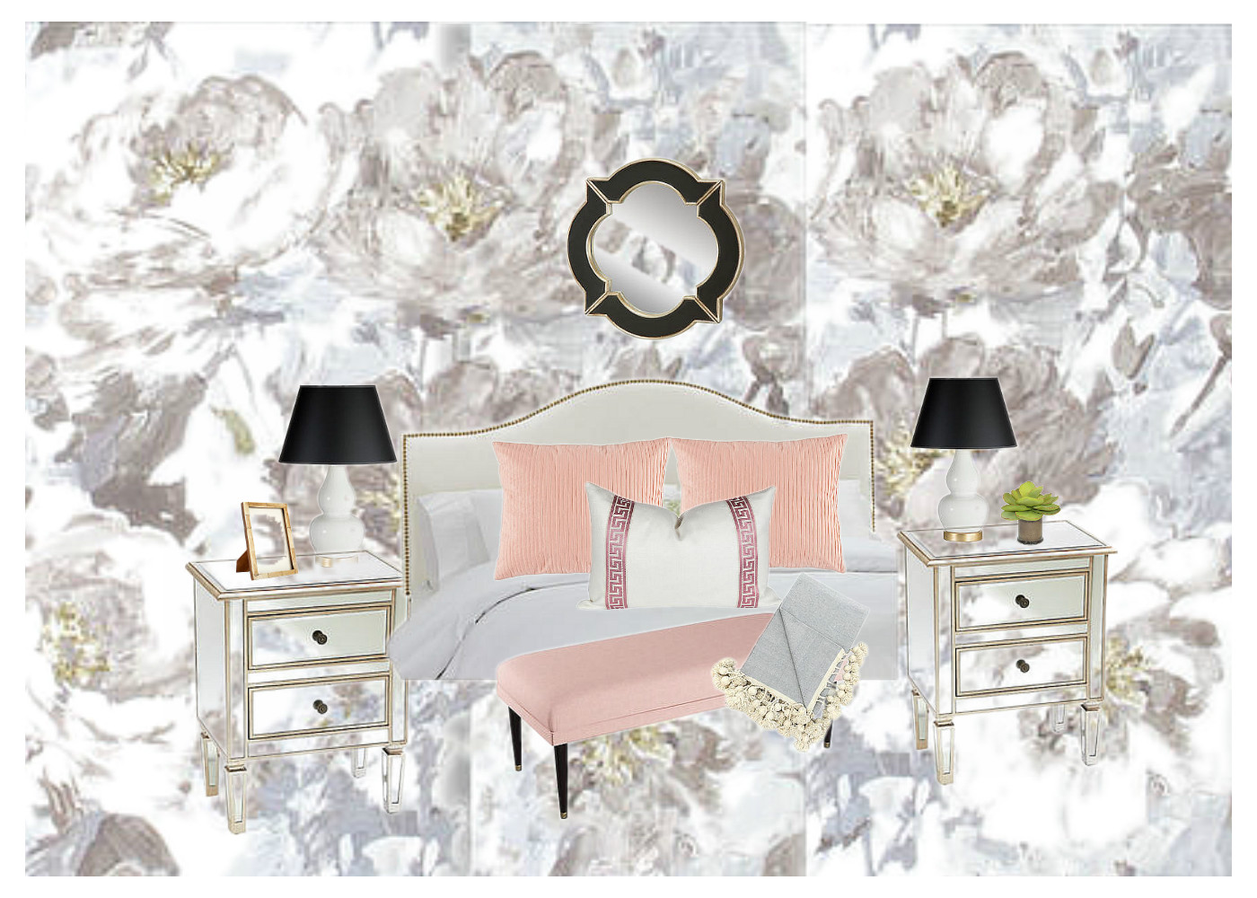 Here’s the inspiration design board I created for my mom’s bedroom.