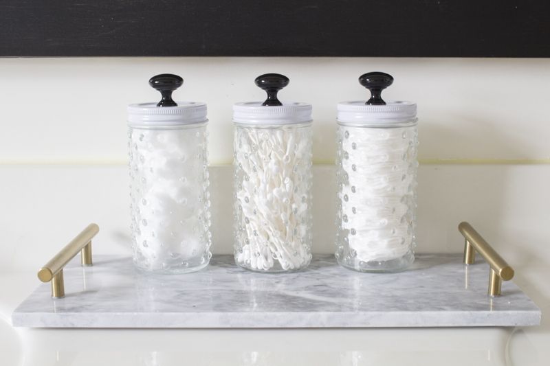 I kept the color palette black and white so that the jars were consistent with their bathroom aesthetic. The knobs make it easy to take the lids off. Look how pretty!! I love it so much. You know your kids are getting older when they start using toner on their face and need cotton pads.