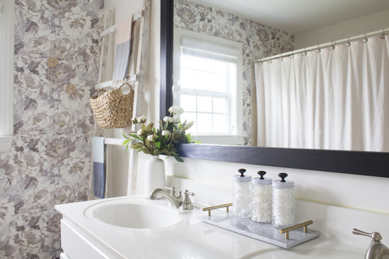 Recently, I updated the kids’ bathroom on a budget. We painted the cabinets, hung wallpaper, built a custom towel ladder, changed out the lighting, and added a frame around the mirror. Both of my older kids share this bathroom and we needed it to function better for them. I’ve learned that when there is an organized system in place for the kids, they are more inclined to keep it that way. Here’s how I organized bathroom jars and made them look pretty too!