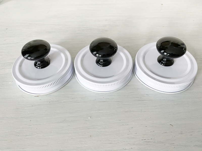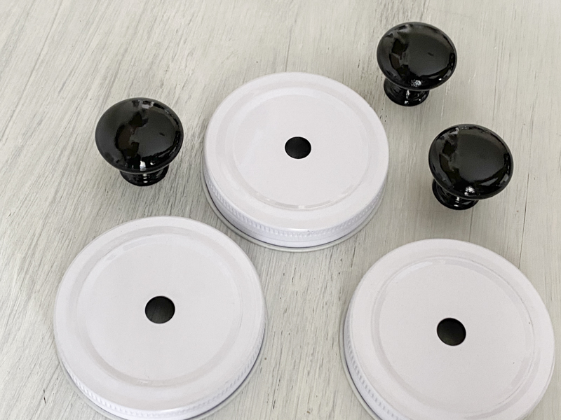Instead of cotton balls and q-tips stored in the drawers, I made them easy to access by storing them on the counter. I took three drinking jars that came with lids and just removed the straws. I wanted to add metal knobs on the lids. Lately, I have been doing so many projects with things I already have at home. These knobs were the original ones from their bathroom cabinets.