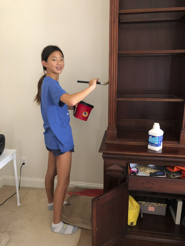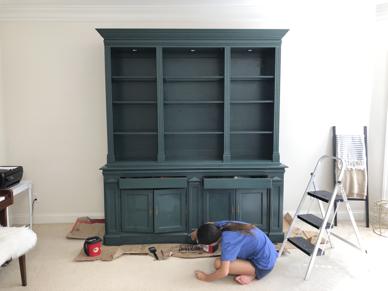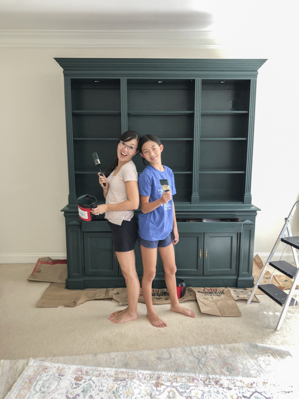 Jimmy lifted up the bookshelf so I could get some paperbags underneath it. This was to protect the carpet. I rolled up the rug and Jules and I got to painting! Jules loves DIY and we spent the afternoon painting and chatting about middle school. It was really such a fun mother daughter time and I love that she wanted to spend time with me painting this beastly bookshelf. There’s nothing like quality time spent doing a DIY project together.