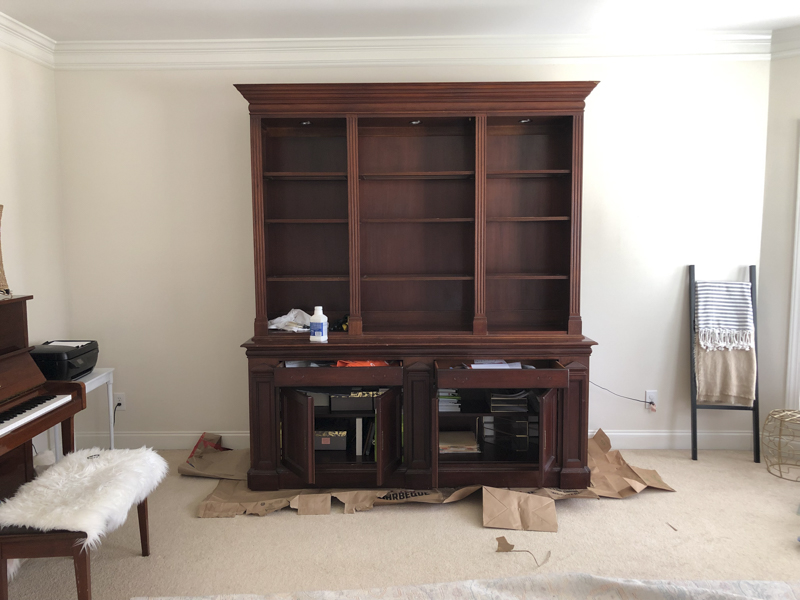 Over the weekend, I completely redid our piano room. After sharing the process on my Instagram, I was flooded with questions on how we painted the bookshelf so I decided to write a blog post so I could just easily direct everyone here to save time. I’m going to preface this with saying that there are a number of ways to paint furniture. But this is how we painted our ugly beastly bookshelf.