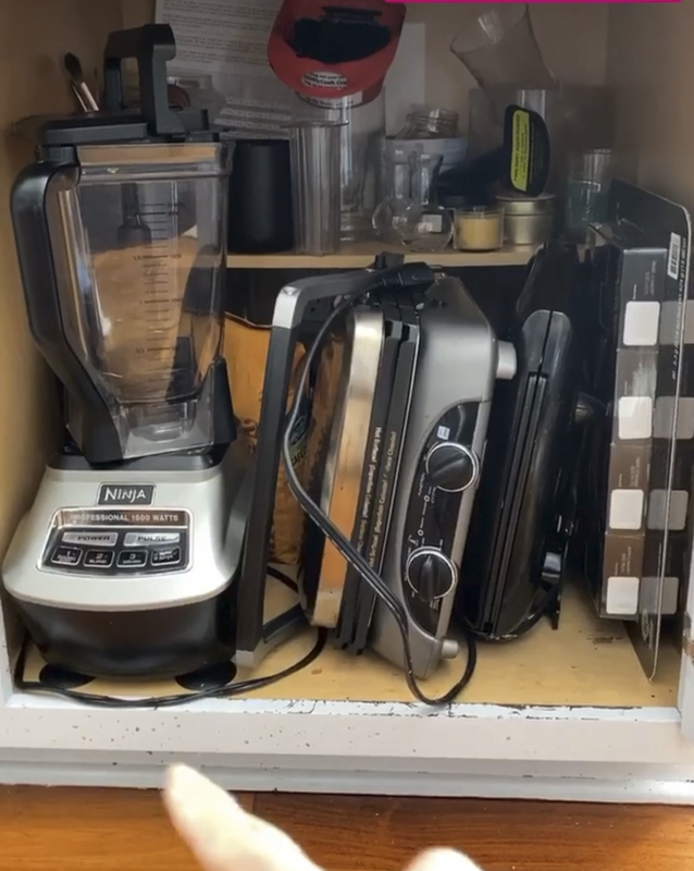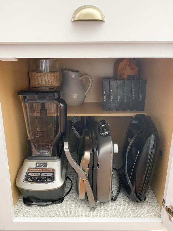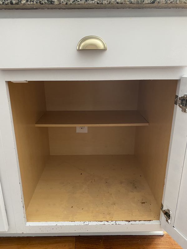 Today, I tackled one cabinet which holds some of our appliances in the kitchen. This cabinet has gotten pretty banged up because it houses our panini maker, blender, waffle maker and food processor. I don’t like to have many appliances out on our counter tops so they are all kept tucked away in cabinets.