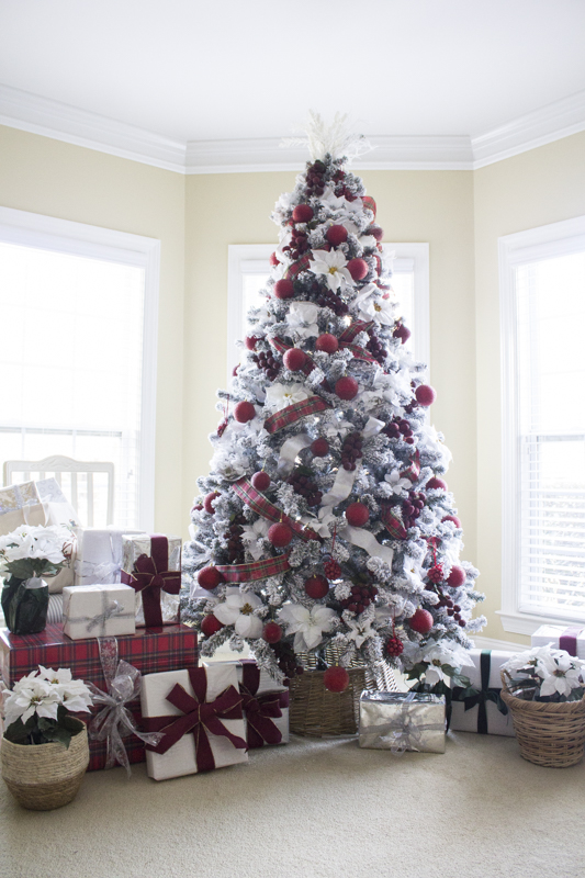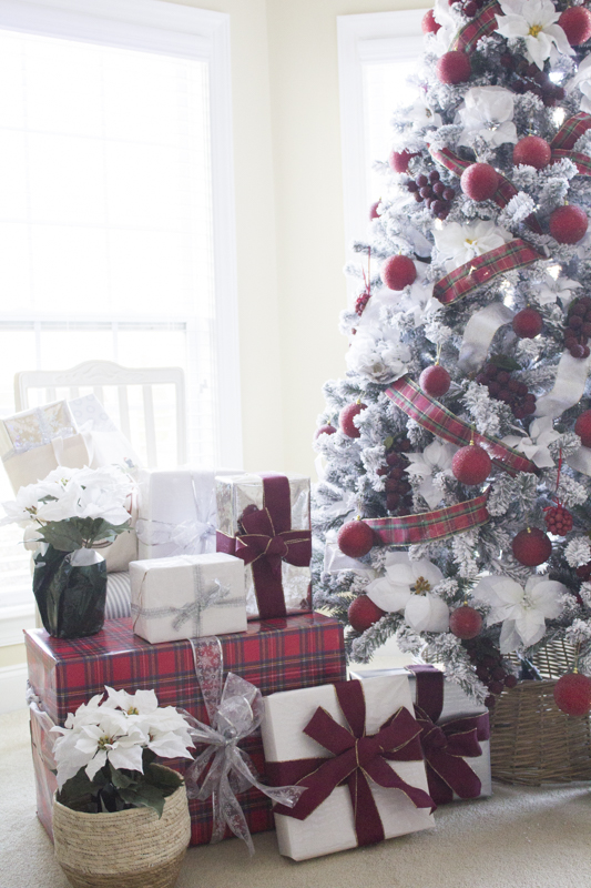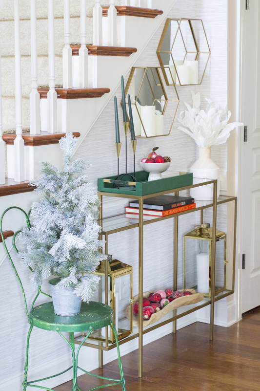 Yuni! Your tree is just stunning!! I love the classic red and white combo and how all the ornaments and ribbon pop against the white flocked tree. It all looks so magical. And now let’s talk about your entry way. That table from HomeGoods was a great find and you have it all decked out to perfection.